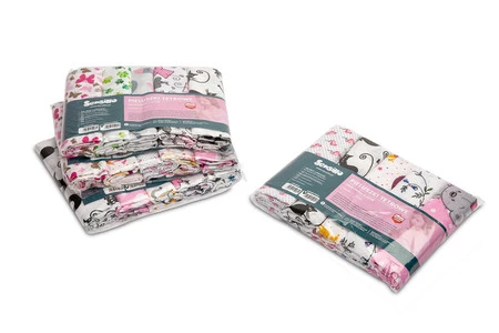 Plenky jsou vyrobeny v sadách po 5 kusech. Vzory v sadách jsou náhodně vybrané podle dostupnosti materiálu. Na druhé straně je vždy zachováno následující rozdělení na sady určené pro chlapce a dívky.