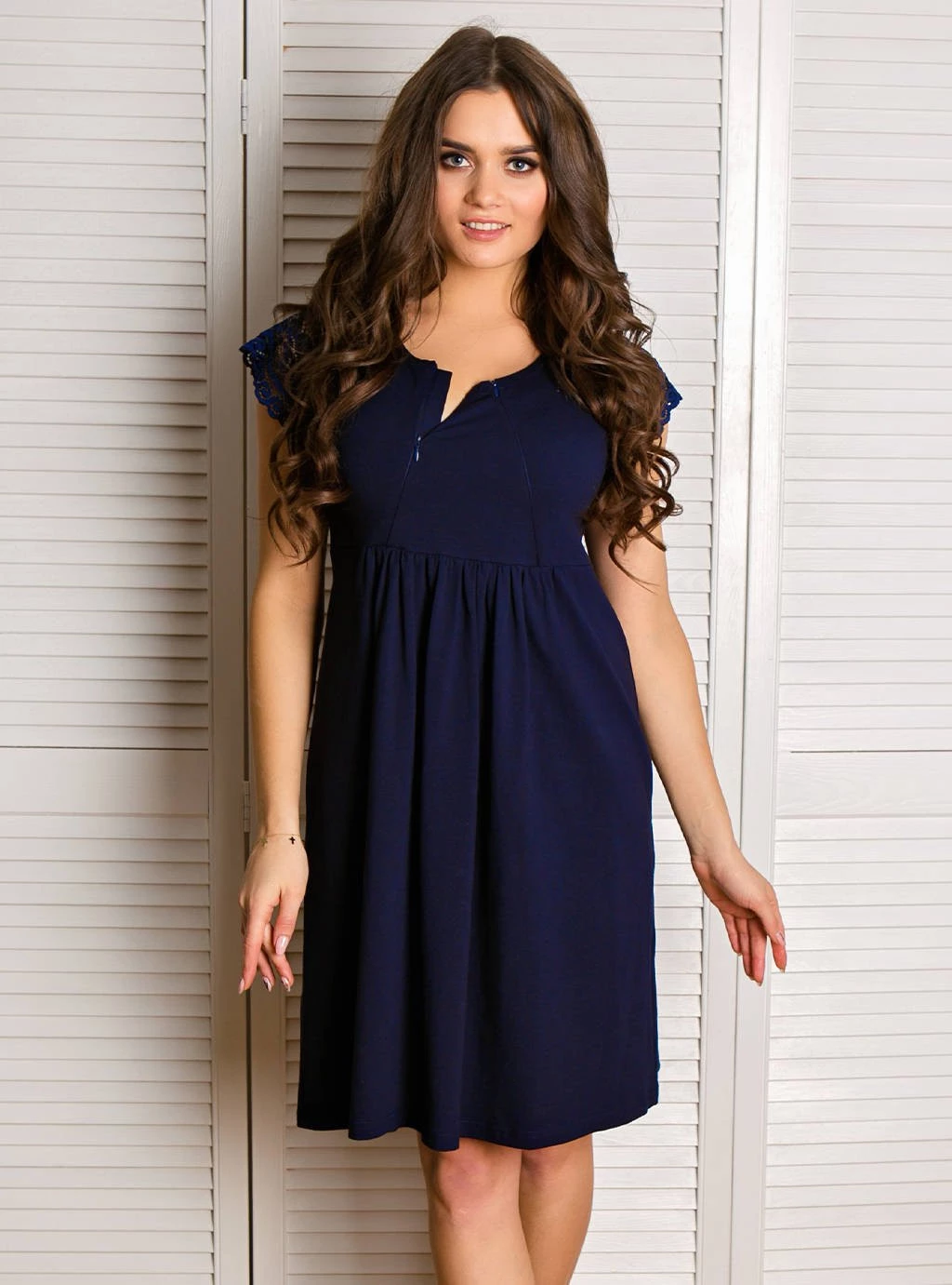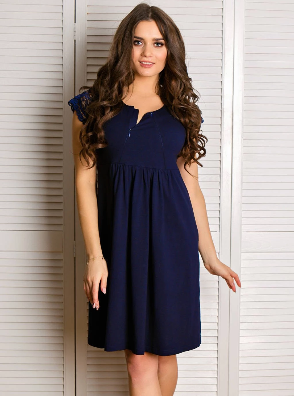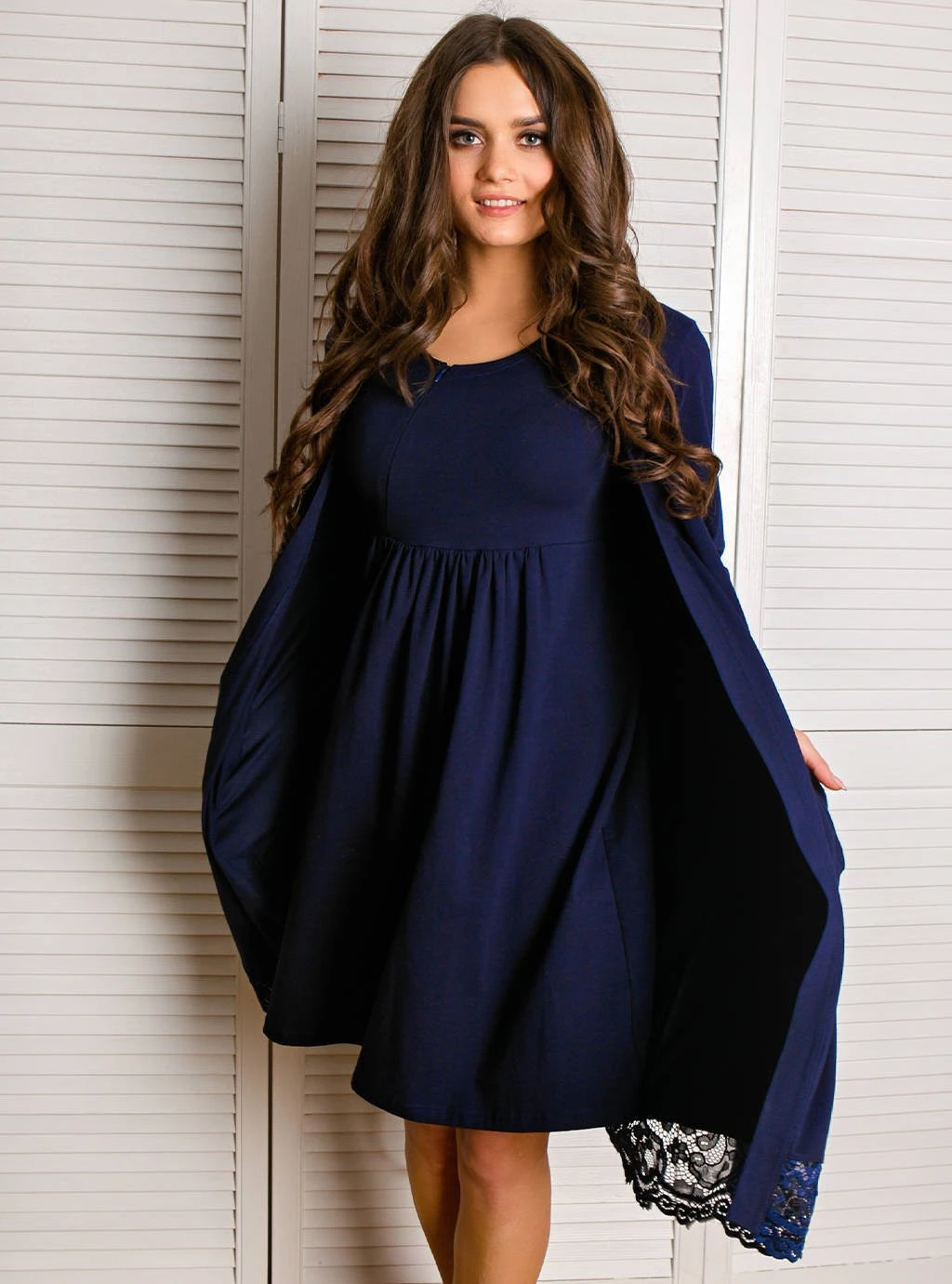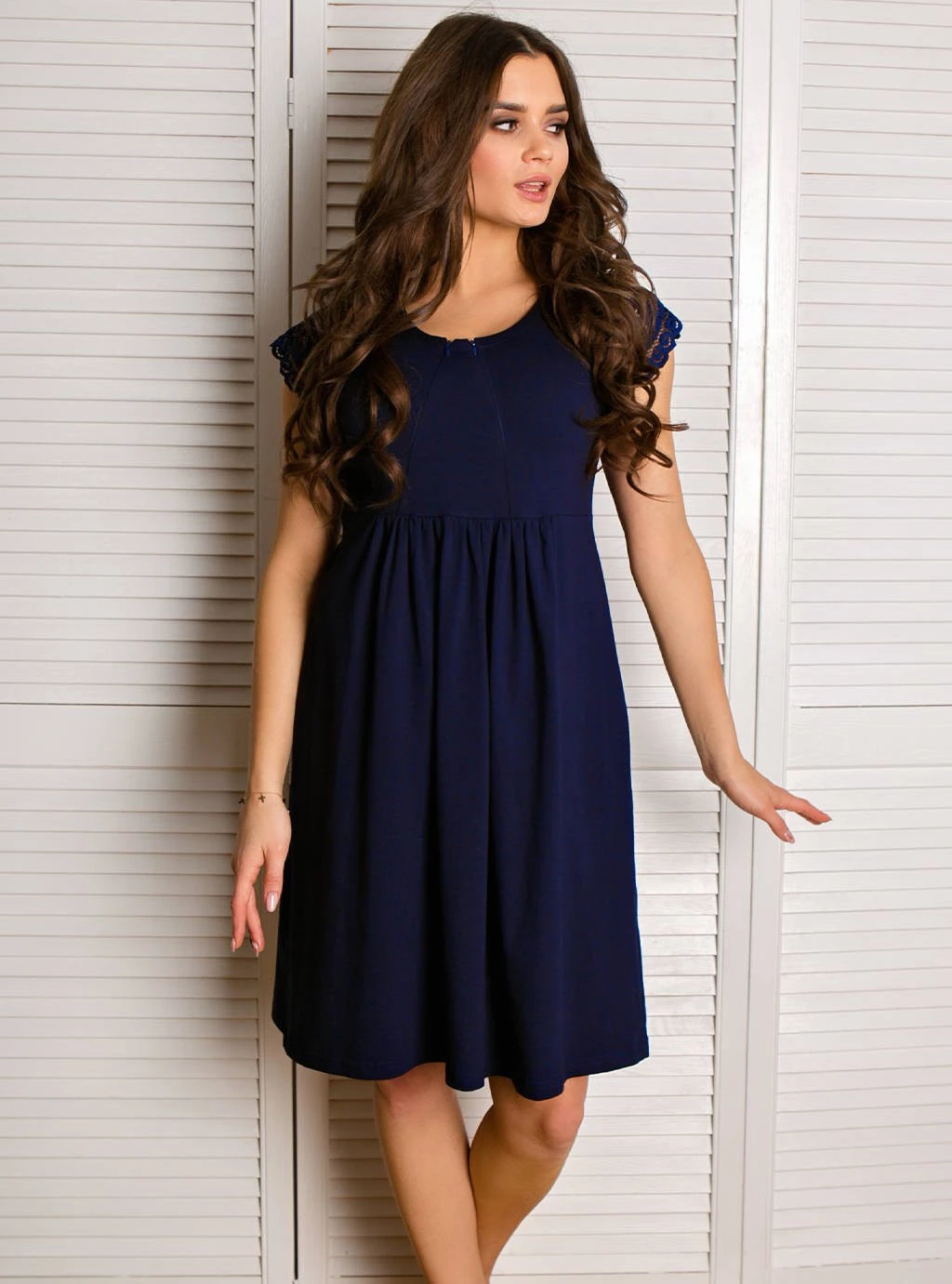 Elegantní tmavě modrá barva a krásně zakončené krajkové rukávytmavě modrá těhotenská košile na zip s krajkousluší každému typu krásy a umožní vám cítit se elegantně a žensky v každé situaci. Skvěle se hodí do domácnosti, ale také jako košilka do porodnice, kdy žena v náročném období těhotenství a těsně po porodu potřebuje zejména oblečení a spodní prádlo, které jí umožní zůstat v pohodlí a cítit se atraktivně a sebevědomě. S košilí Bella to nebude obtížné, protože byla navržena v tak jedinečném stylu, že vypadá jako klasické šaty s vysokým pasem.