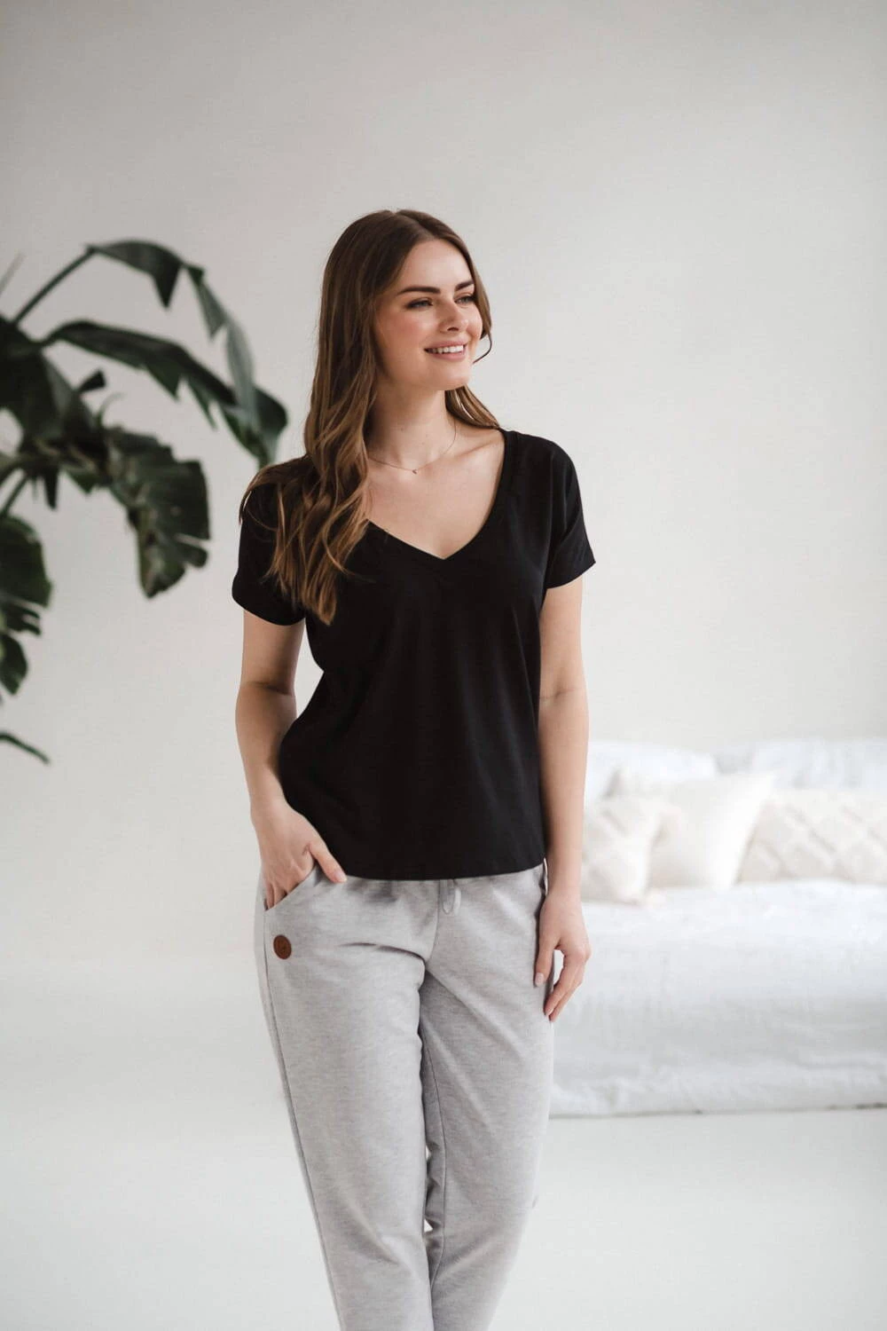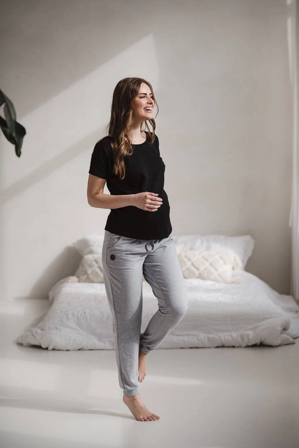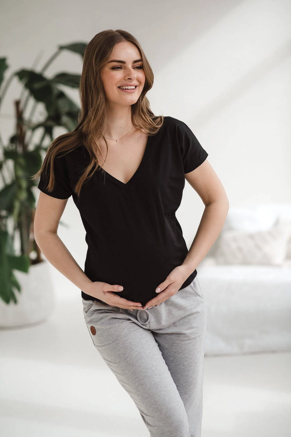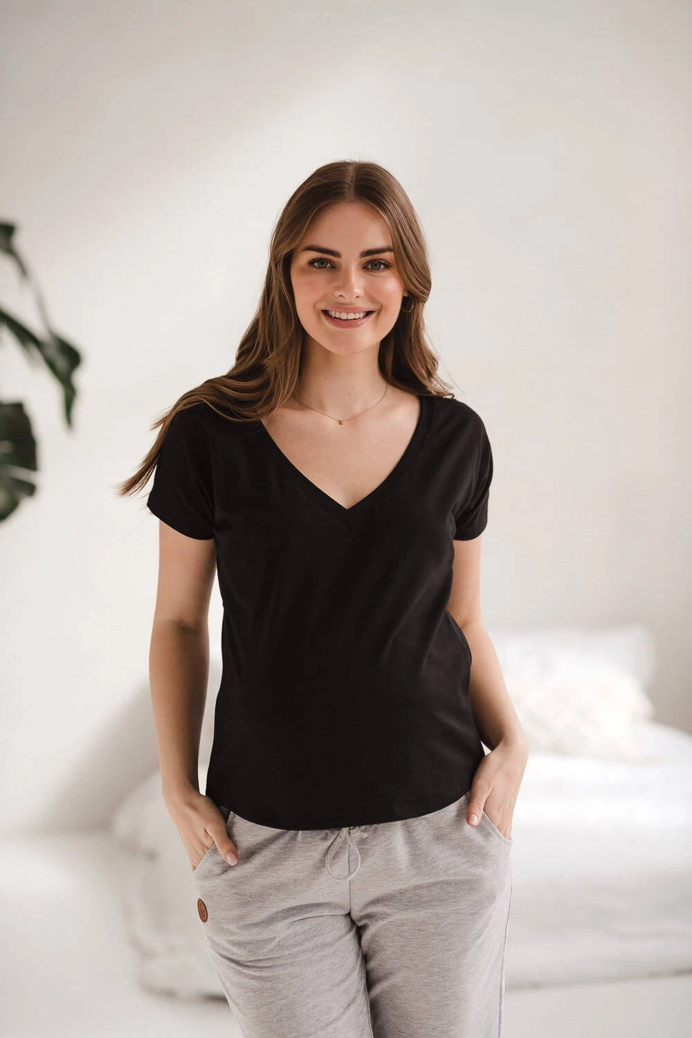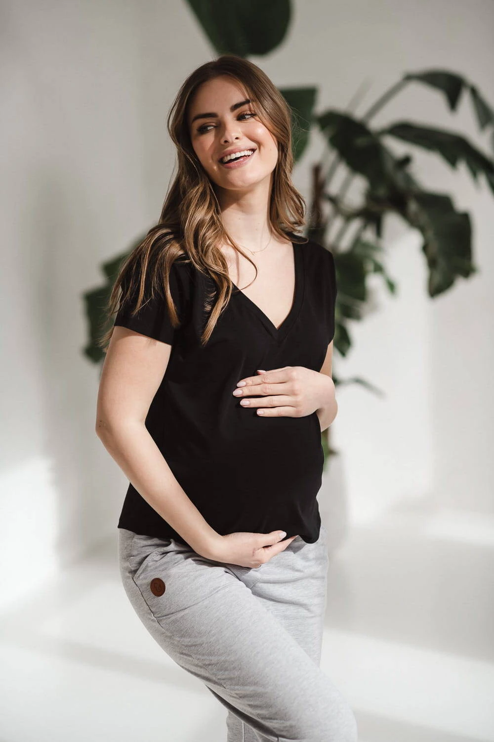 Oboustranná černá perfektní těhotenská halenka pro kojící ženy v basic stylu. Módní těhotenská halenka a pro čerstvé maminky je kvintesencem stylu a ženskosti v šatníku. Letní těhotenské halenky s pohodlnými zipy na krmení vám umožní diskrétně a snadno krmit miminko i na veřejných místech, jako je galerie nebo park. Jako každá základní dámská halenka je i tato ženská těhotenská halenka pro budoucí maminky dokonalým těhotenským stylem a základem pro váš každodenní styling.