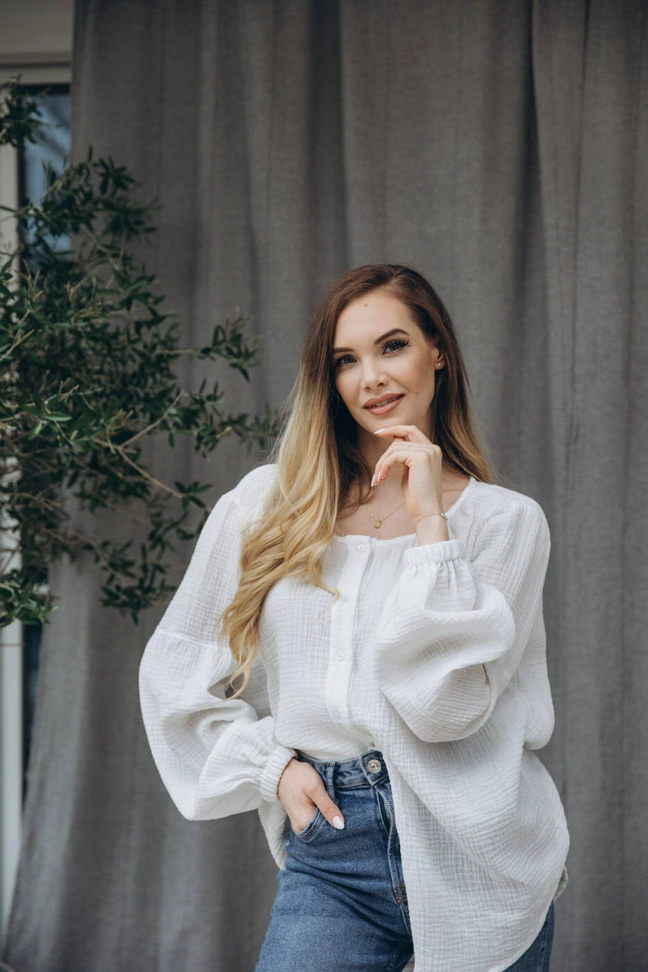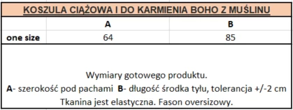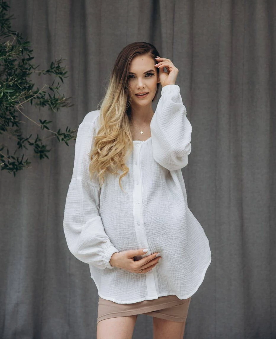 Elegantní mušelínová halenka Boho byla vytvořena s ohledem na budoucí maminky a kojící maminky. Tato jedinečná bílá košile pro ženy kombinuje styl, pohodlí a funkčnost. Vyrobeno z měkkého a vzdušného mušelínu, zajišťuje pohodlí po celý den. Její lehký materiál je jemný k pokožce a prodyšný, což je velmi důležité pro komfort nošení bez ohledu na fázi těhotenství. Praktické knoflíky umístěné na přední straně košile umožňují snadný a diskrétní přístup k prsům během krmení, díky čemuž je košile extrémně funkční.