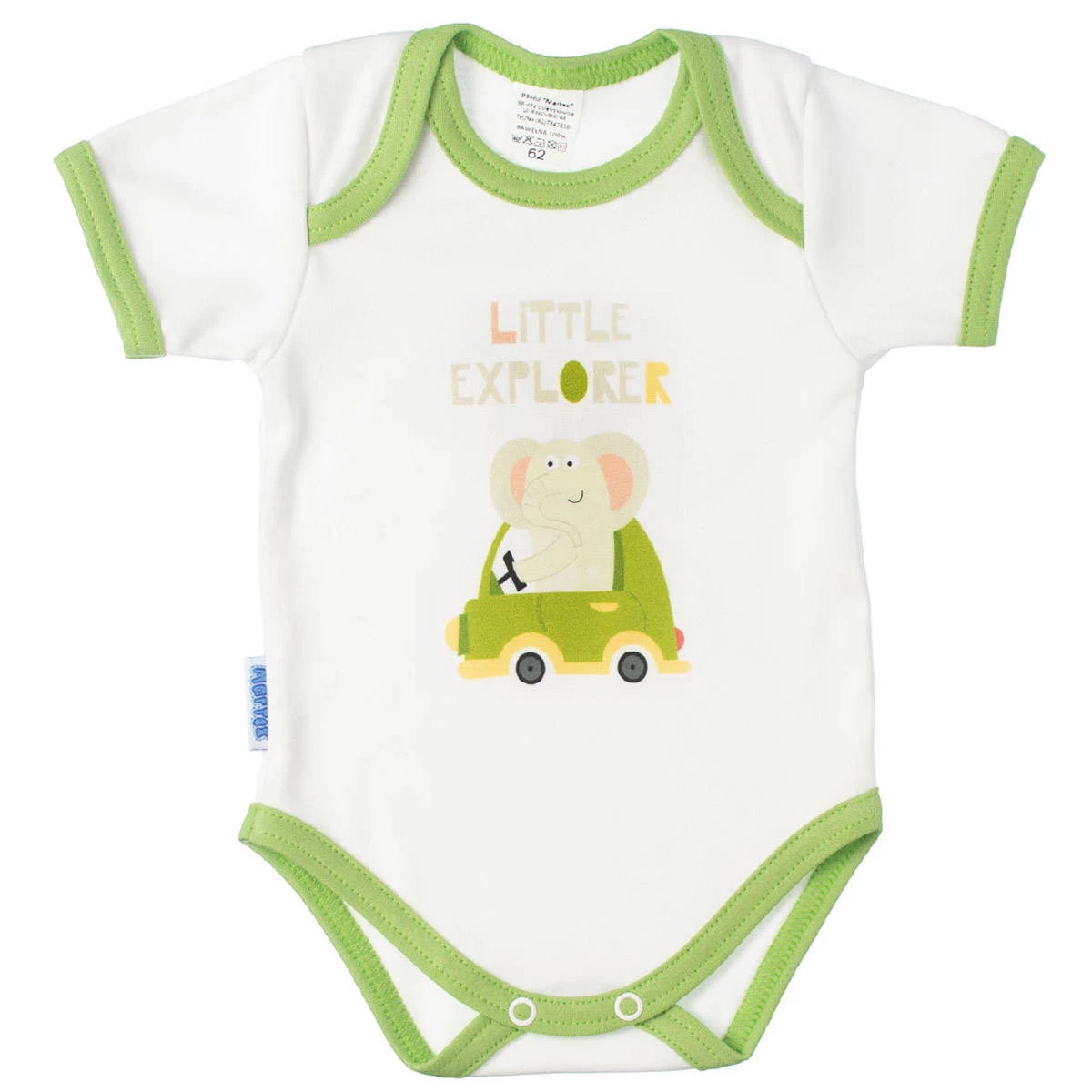 Pokud hledáte pohodlné body, ve kterém bude vaše dítě bezpečně a pohodlně odpočívat a poznávat svět, jste na správném místě. Bílý medvídek s veselým slonem zakončeným zeleným lemem je perfektní volbou pro teplé letní dny. Body s krátkým rukávem zapínaným v rozkroku pro snadné přebalování miminka z na dotek příjemné bavlny potěší měkkostí a vysokou kvalitou zpracování. Patentky bez obsahu niklu nezpůsobují citlivost dítěte ani rodiče během krmení nebo přebalování.