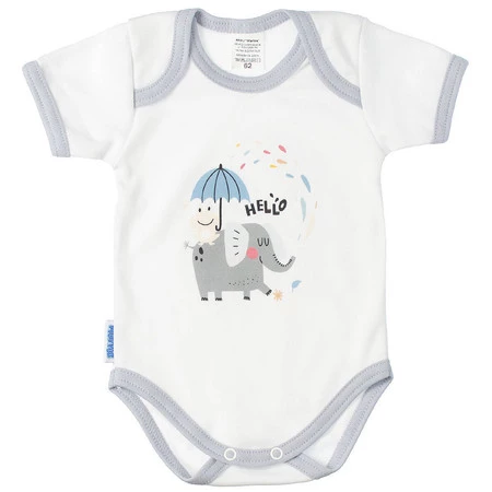 Pokud hledáte pohodlné body, ve kterém bude vaše dítě bezpečně a pohodlně odpočívat a poznávat svět, jste na správném místě. Bílý medvídek s roztomilým slonem zakončeným šedým lemem je perfektní volbou pro teplé letní dny. Body s krátkým rukávem zapínaným v rozkroku pro snadné přebalování miminka z na dotek příjemné bavlny potěší měkkostí a vysokou kvalitou zpracování. Patentky bez obsahu niklu nezpůsobují citlivost dítěte ani rodiče během krmení nebo přebalování.