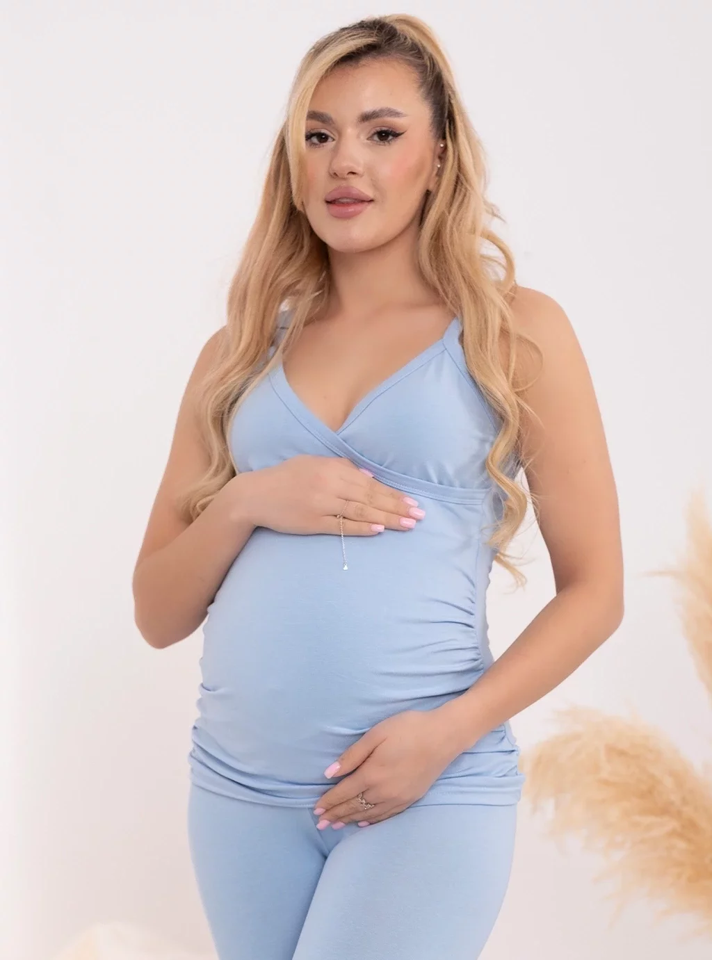 Jemná modrá barva této halenky se hodí ke každé příležitosti již od začátku těhotenství. Těhotenské halenky Sandy mají na obou stranách bříška řasení , které se přizpůsobí rostoucímu bříšku a měnícímu se postavě. V horní části modré těhotenské blůzy je všitý speciální panel , který se shrne na stranu, díky čemuž můžete své novorozeně snadno a rychle nakrmit. Těhotenská a kojící trička vám poskytnou pohodlí a komfort v těhotenství a později při kojení.