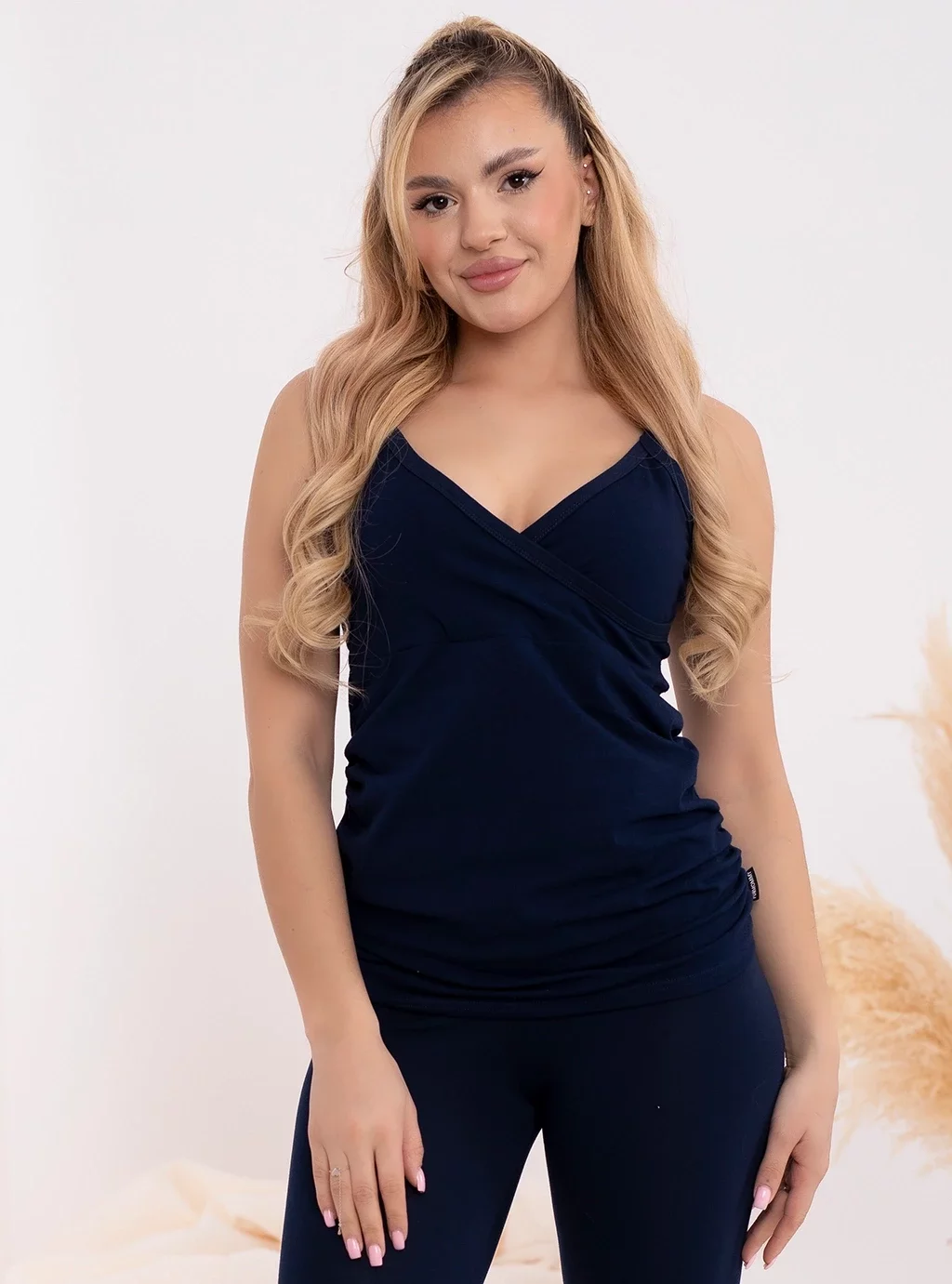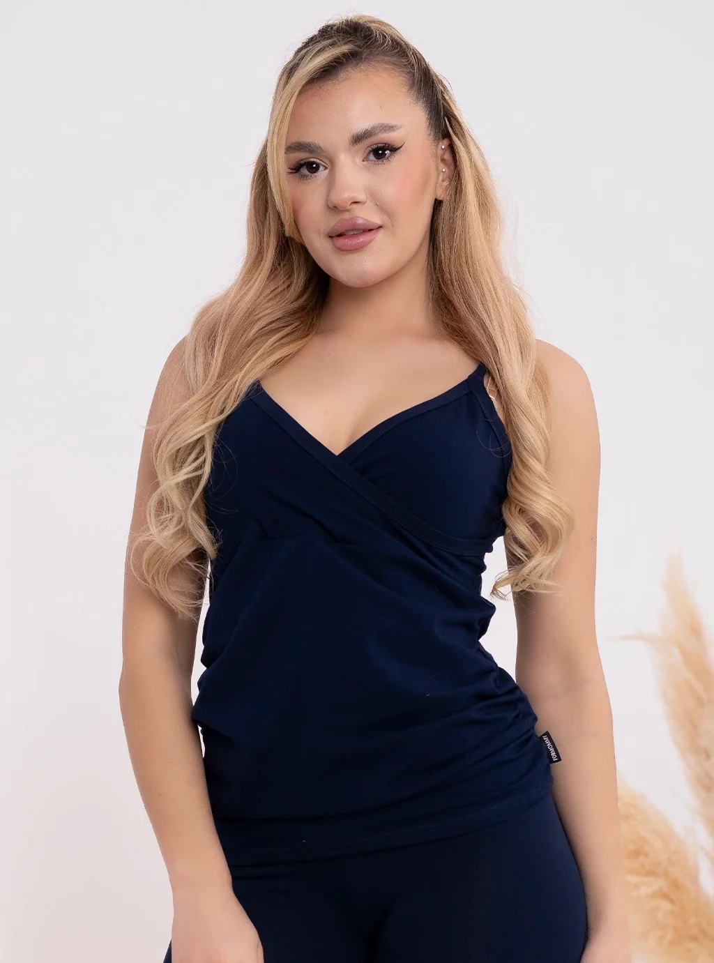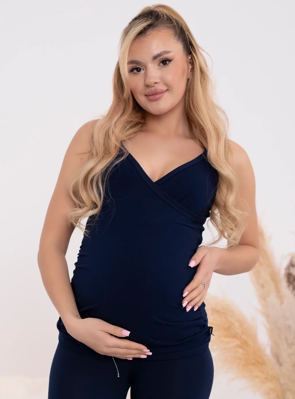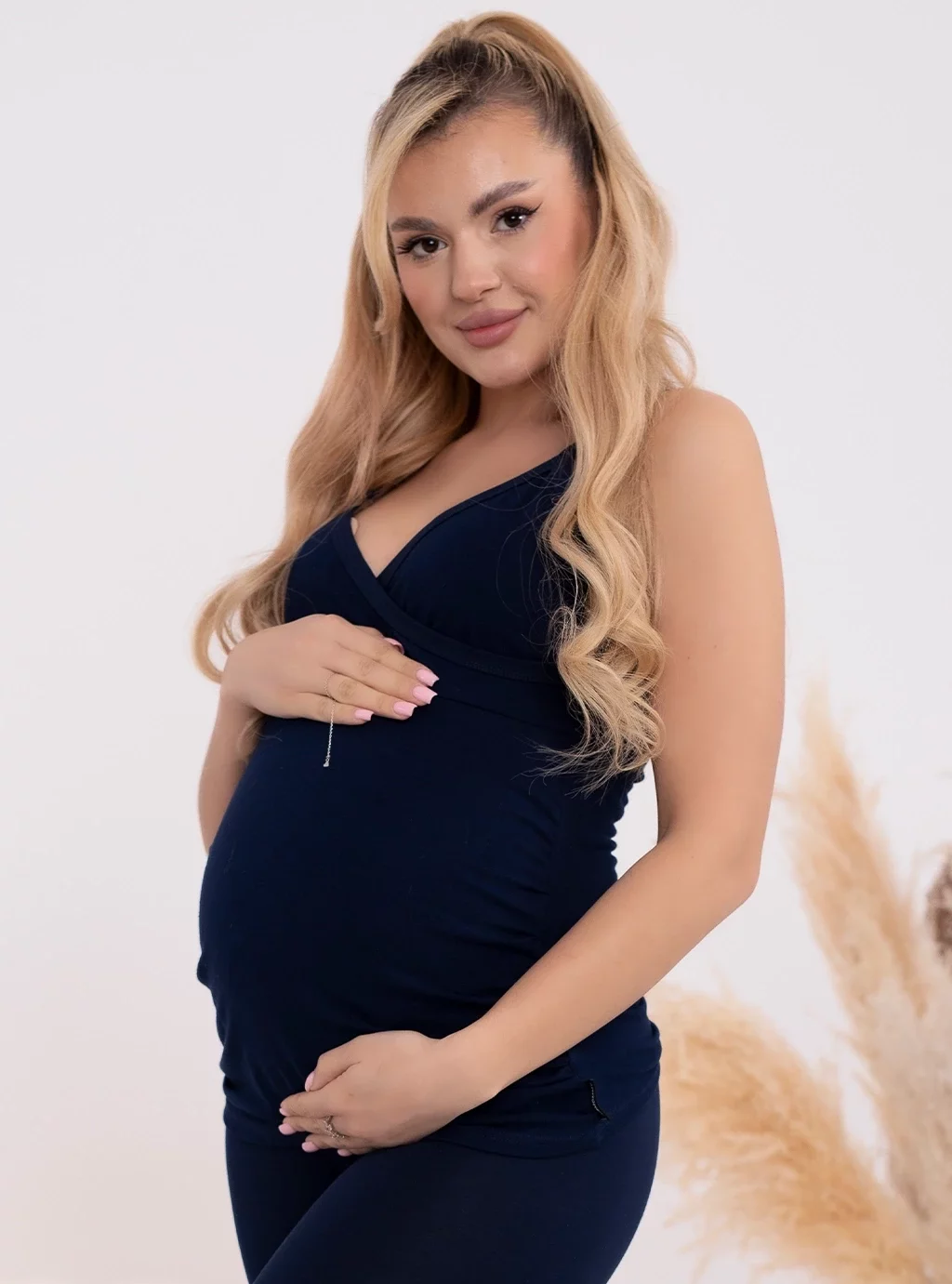 Objevte jedinečnou těhotenskou halenku na ramínka v tmavě modré barvě. Tento model byl pečlivě navržen pro budoucí a mladé maminky, které oceňují styl a praktičnost. Letní těhotenská blůza v námořnické modré barvě umožňuje pohodlné a diskrétní krmení miminka pouhým rozepnutím záhybu horní části košile. Vypasovaný střih zajišťuje komfort nošení zejména v poporodním období.