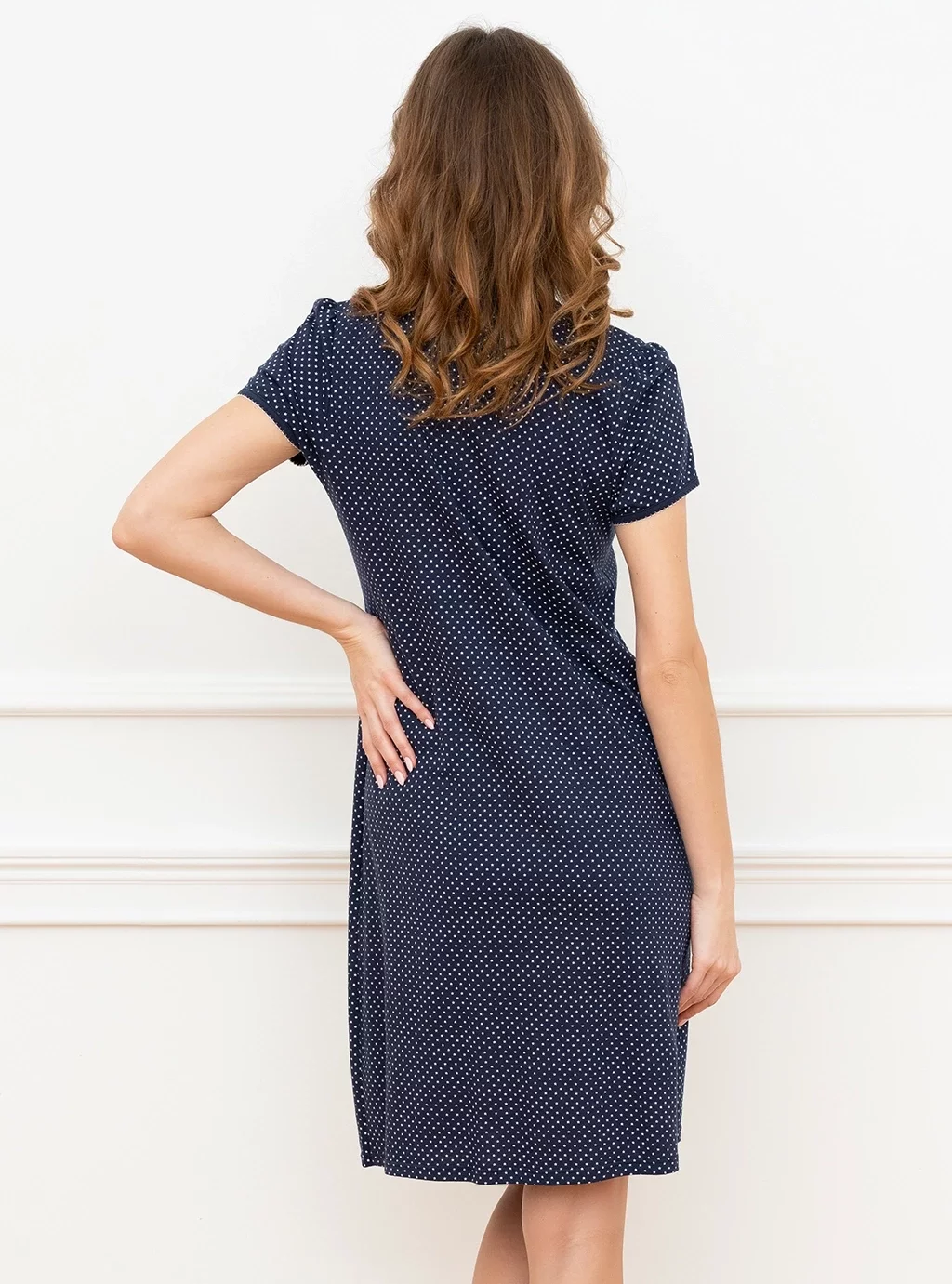 Námořnická modrá těhotenská košile s malými tečkami, zapínání na řasení, vyznačující se vzdušnou měkkou bavlnou, která usnadňuje kojení. Elastický pás pod prsy dodává pohodlí a styl. Je to ideální volba pro těhotné ženy, které si připravují výbavičku. Tato dámská noční košilka na krmení novorozence Vám zajistí pohodlí a zdravý spánek v těhotenství a kojení. V našem internetovém obchodě nabízíme těhotenské oblečení a noční košilky, které jsou vzdušné a mimořádně příjemné na dotek. Všechny těhotenské noční košilky jsou určeny pro budoucí a mladé maminky, které potřebují pohodlí a praktičnost při nočním krmení novorozence. Naše těhotenské košilky a noční prádlo perfektně padnou na rostoucí bříško a měnící se postavu a zajišťují maximální pohodlí později při krmení miminka.