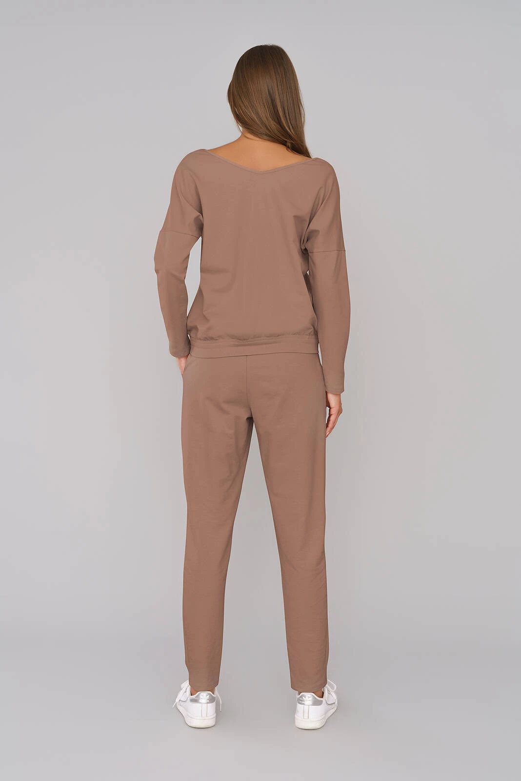 Karamelový odstín dodává této sadě eleganci a klasický šarm. Mikina bez kapuce s výstřihem do V a dlouhé kalhoty rovného střihu tvoří harmonický celek, který vypadá skvěle na každé postavě. Tato tepláková souprava s uvolněným, oversized střihem vyzařuje sportovní charakter, který je módní i praktický. Je ideální jak na procházku, tak na setkání s přáteli.