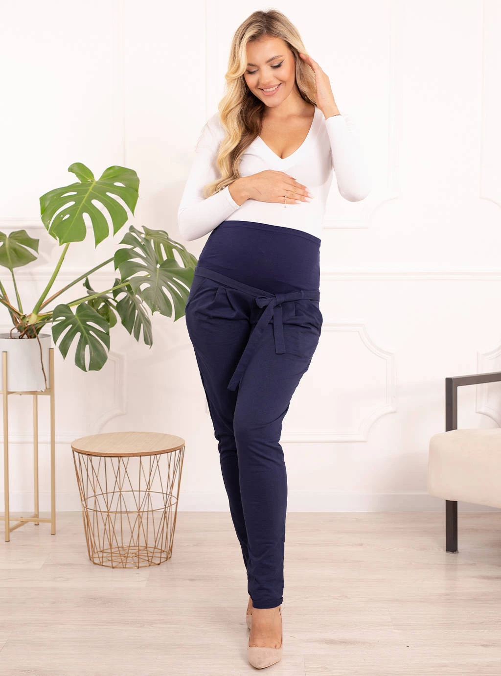 Krásné a pohodlné dámské těhotenské tepláky. Navrženo a ušito tak, aby zaručovalo maximální pohodlí a snadné nošení během jedinečného období těhotenství a po porodu. Přiléhá k břichu, aniž by objímalo nebo tlačilo na tělo. Těhotenské kalhoty tepláky mají záhyby v úrovni pasu spolu s přední kapsy a přídavný pásek, který se zavazuje do tvaru mašle a dodává jim elegantní styl. Jejich nejdůležitějším přínosem je netlačící pásek všitý do pasukterý se přizpůsobí břichu a zvýrazní postavu.