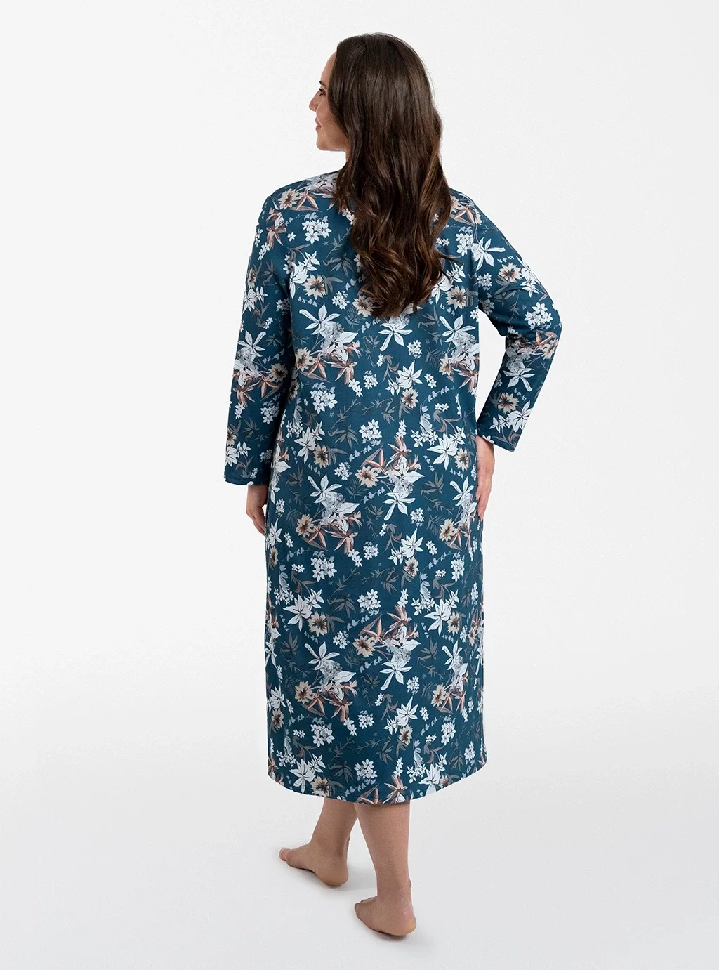 Jedinečná dámská noční košile Hariet s dlouhým rukávem s květinami a modrou barvou je spojením pohodlí, funkčnosti a romantického designu, díky kterému se každá žena bude při spánku cítit krásně a pohodlně.
