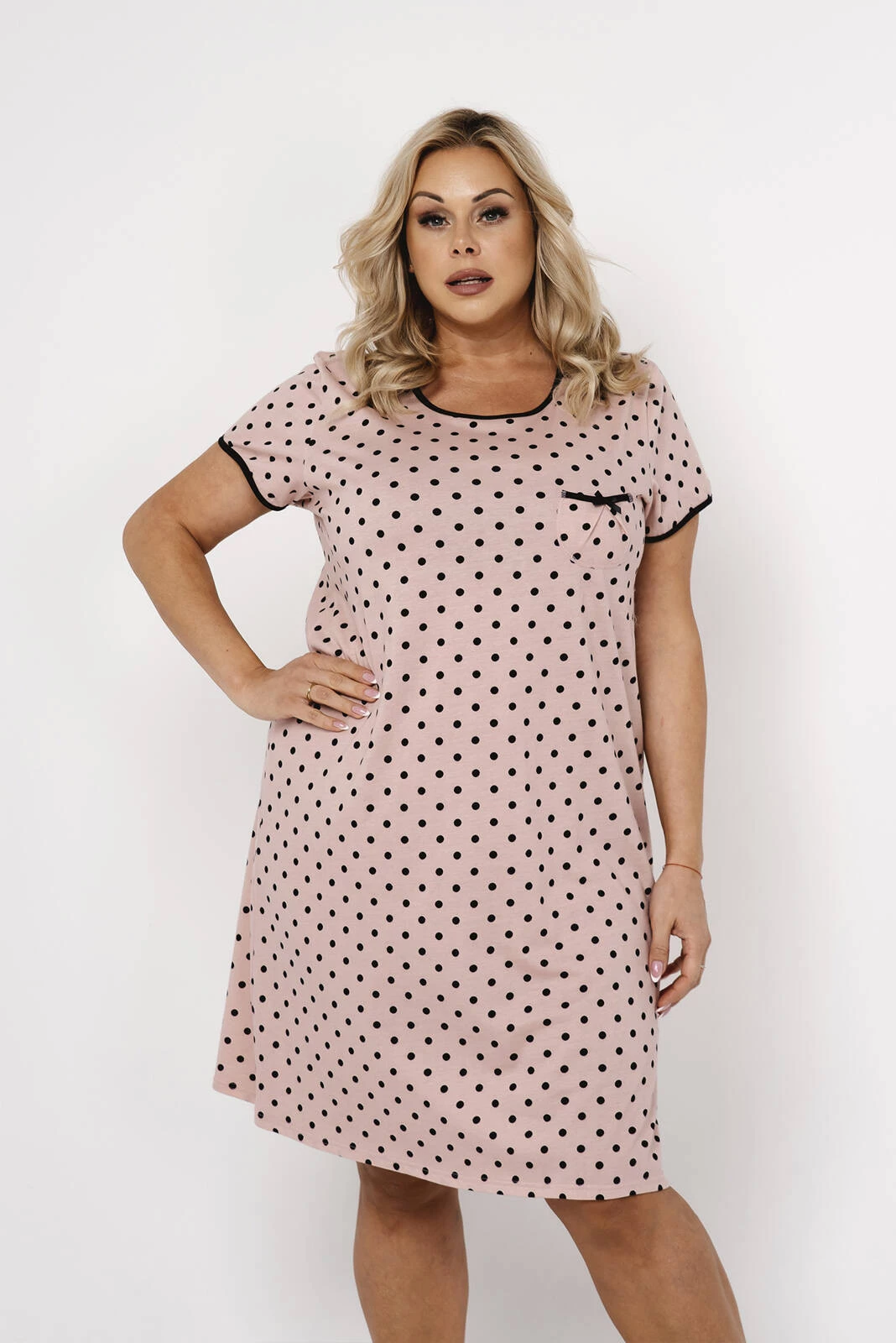 Dámská košile Bonilla je nejen perfektní volbou na letní večery, ale také elegantním kouskem oblečení, který podtrhne váš jedinečný styl. Díky krátkým rukávům a volnému dnu zajišťuje optimální tepelný komfort i během teplejších nocí. Černé puntíky na pudrovém pozadí dodávají pyžamu šarm a romantiku, díky čemuž je každý okamžik strávený v něm jedinečný a relaxační. Kvalitní materiály a pečlivé zpracování zaručují, že vás pyžamo bude provázet mnoho nocí a zachová si své vynikající vlastnosti.