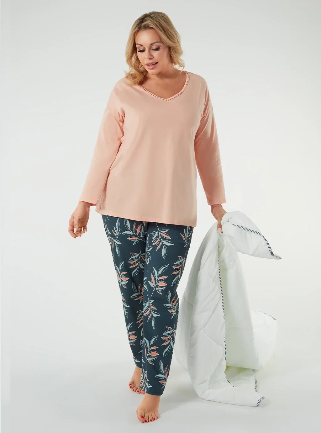 Dámské lososové pyžamo Julietta je stylový a pohodlný set pro chladnější noci. Set obsahuje tričko s dlouhým rukávem a výstřihem do V a dlouhé, měkké kalhoty, které poskytují plnou svobodu pohybu. Halenku zdobí výrazný lem ve tvaru V, kalhoty mají potisk větviček na zeleném podkladu, který celé kompozici dodává lehkost a svěžest. Dámské pyžamo vyrobené ze 100% bavlny zaručuje pohodlí a prodyšnost, ideální pro letní noci. Výrobek je vyroben v Polsku, což dokazuje vysokou kvalitu zpracování a smysl pro detail.