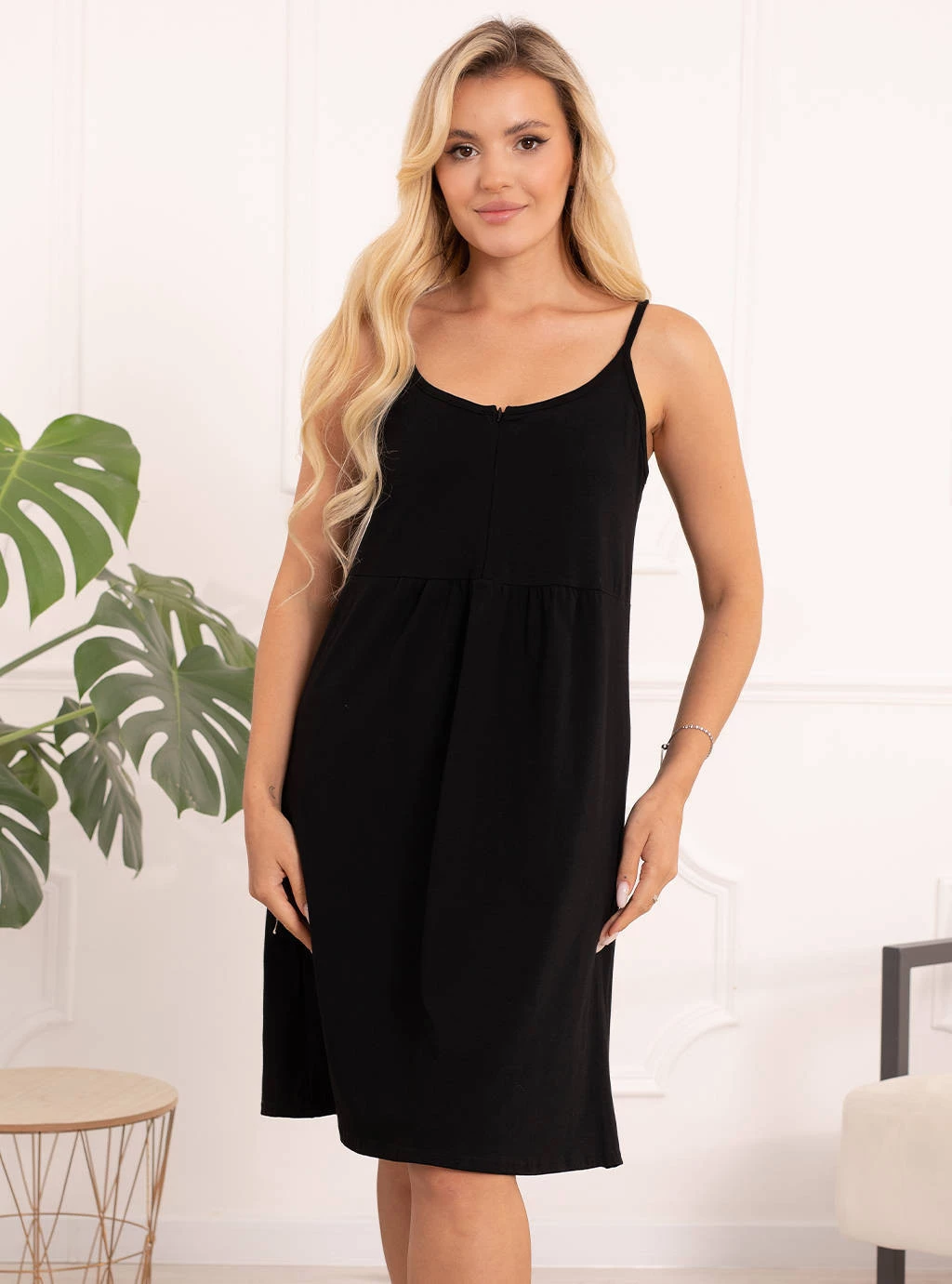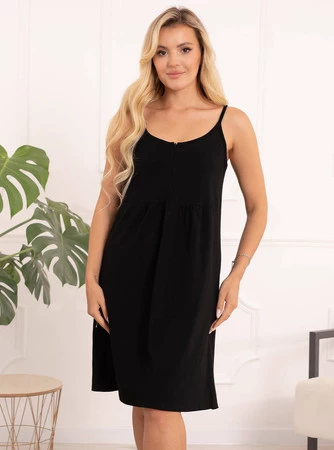 Černá těhotenská košile bez ramínek kromě toho, že je funkční a praktická, má pro mnoho žen i další, možná velmi důležitou výhodu - vůbec nevypadá jako typický a standardní model kojící košile. Zip uprostřed je velmi diskrétní a vůbec nenaznačuje kojení a střih se vůbec neliší od běžných dámských nočních košil, které najdete v běžných obchodech s oblečením. Těhotenská košile je v horní části poměrně vypasovaná, ale dále se jemně rozšiřuje. Materiál, ze kterého je ušita, je pružný a černá barva je velmi univerzální a hodí se pro ženy se světlými i tmavými vlasy. Online mateřský butik Formommy se postaral o to, aby byla košilka příjemná na dotek pro maminku i miminko.