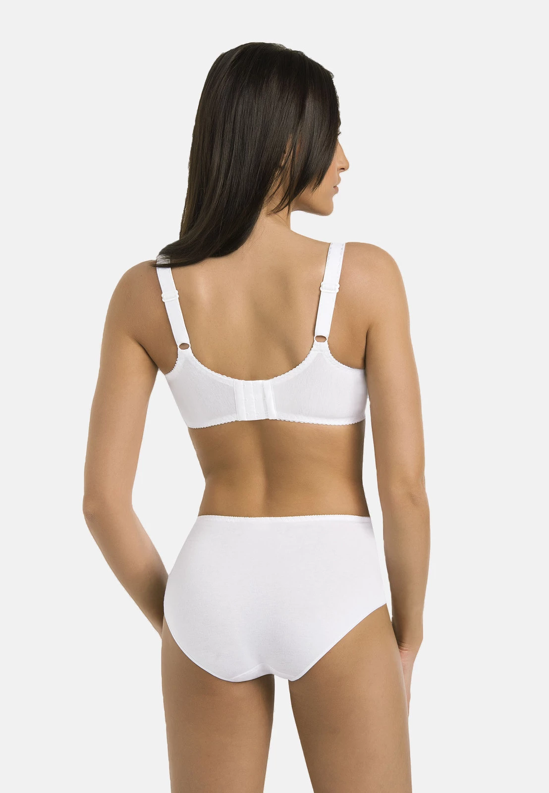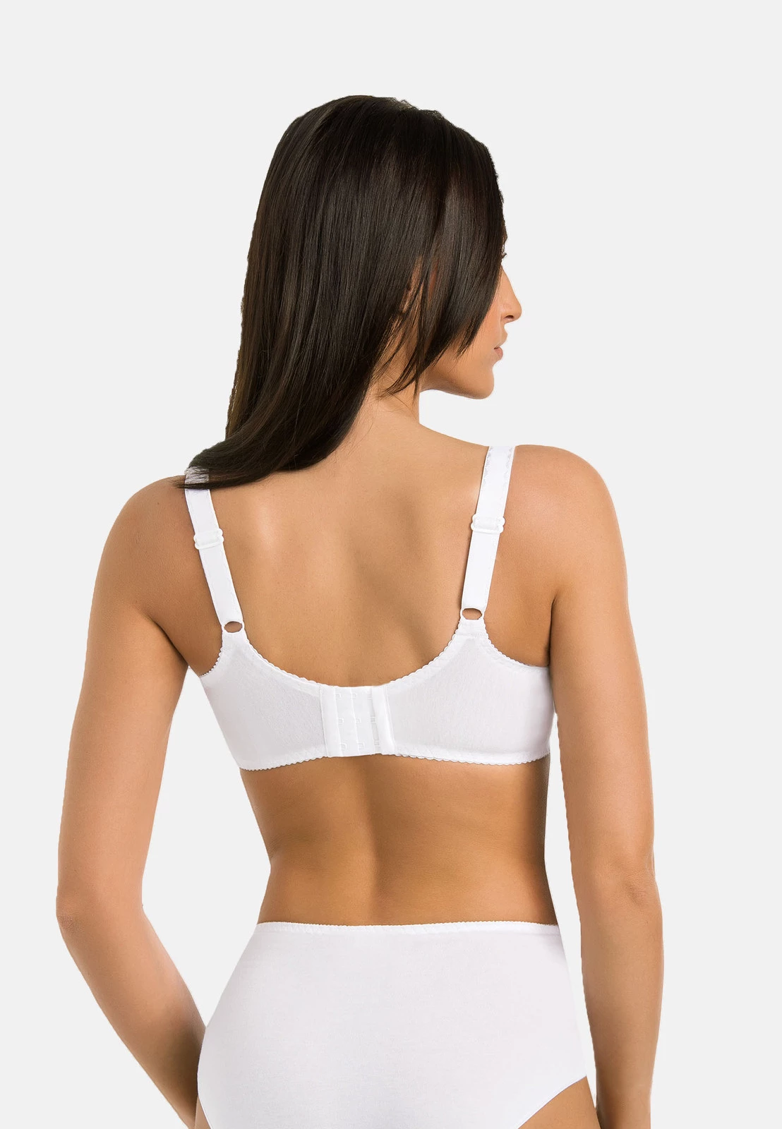 Bavlněná podprsenka Anastasia pro kojící maminky v bílé barvě je výbornou volbou pro ženy, které si cení pohodlí a elegance při kojení. Ideální kojící podprsenka vyrobená z vysoce kvalitní bavlny s kosticemi a bočními vsadkami z Lycry, které zajišťují dokonalé přizpůsobení postavě. Horní část košíčků je zdobena jemnou, květinovou krajkou, která je měkká a příjemná na dotek a nezpůsobí miminku žádné alergické reakce při kojení.