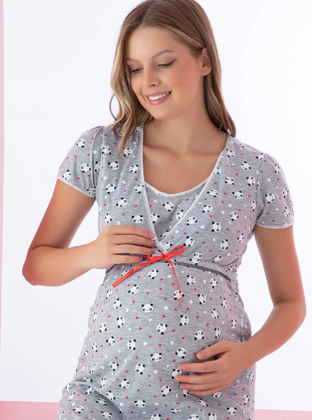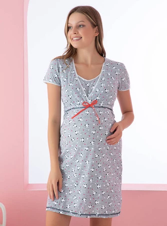 Šedá kojící košile s pandou na zobrazeném modelu je sice určena těhotným a kojícím ženám, ale je velmi diskrétní. V horní části se mírně vypasovaný střih rozšiřuje směrem dolů a jemný střih pod prsy v podobě ozdobného lemování a červené mašle zvýrazňuje pas jemný střih pod poprsím v podobě ozdobného lemování a červené mašle zvýrazňuje pasa nešetřit na obrázku. Světlé lemy ve výstřihu, na rukávech a na záložce dodávají pyžamu půvab. Pohodlný střih a široká základna (těhotenské košile jsou k dispozici ve velikostech S až XXL) znamená, že překrývající se košile může být dobrou volbou i pro samotný den porodu. Dokonalým doplňkem košile bude odpovídající těhotenský župan a kojící podprsenka.