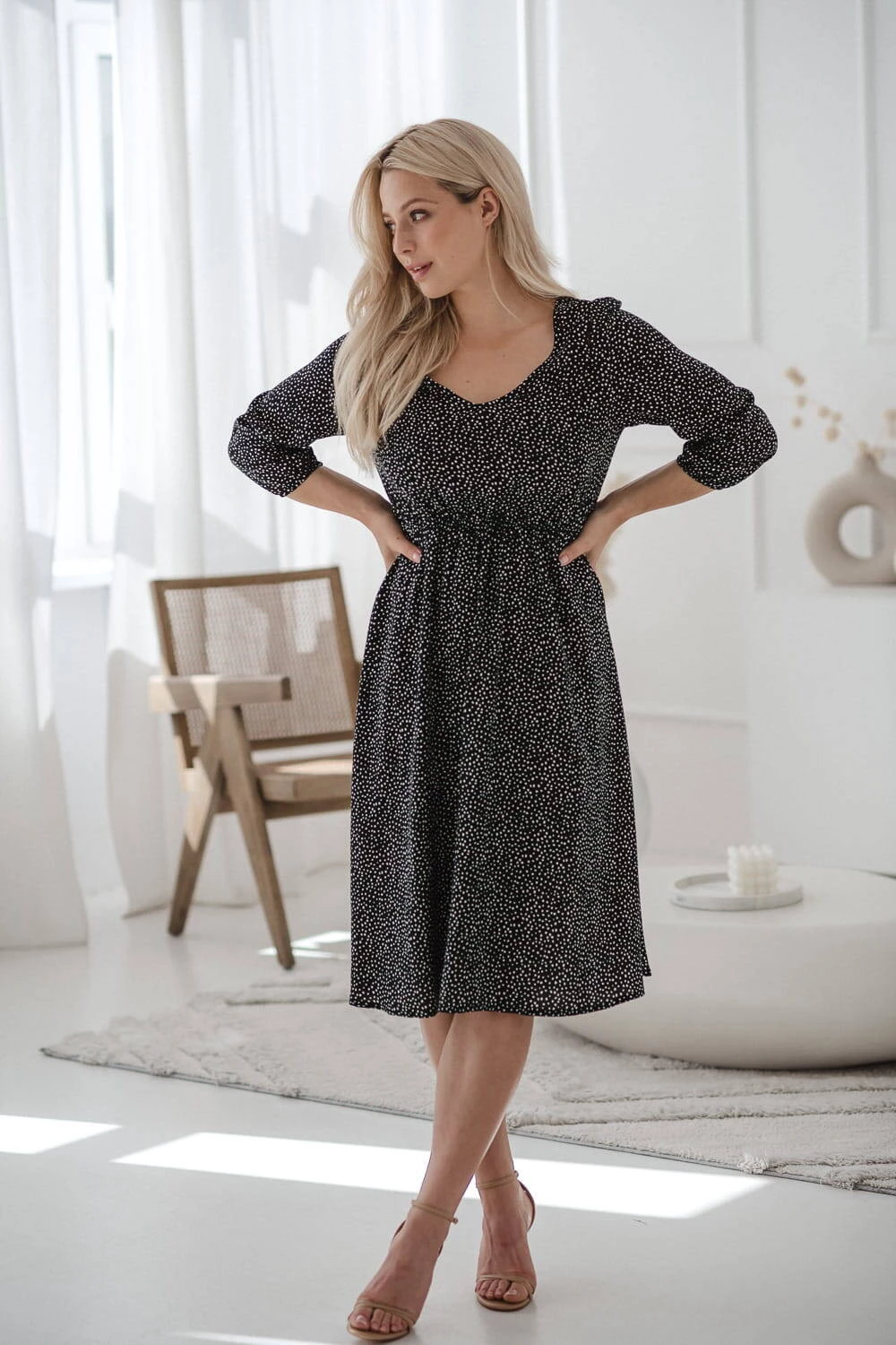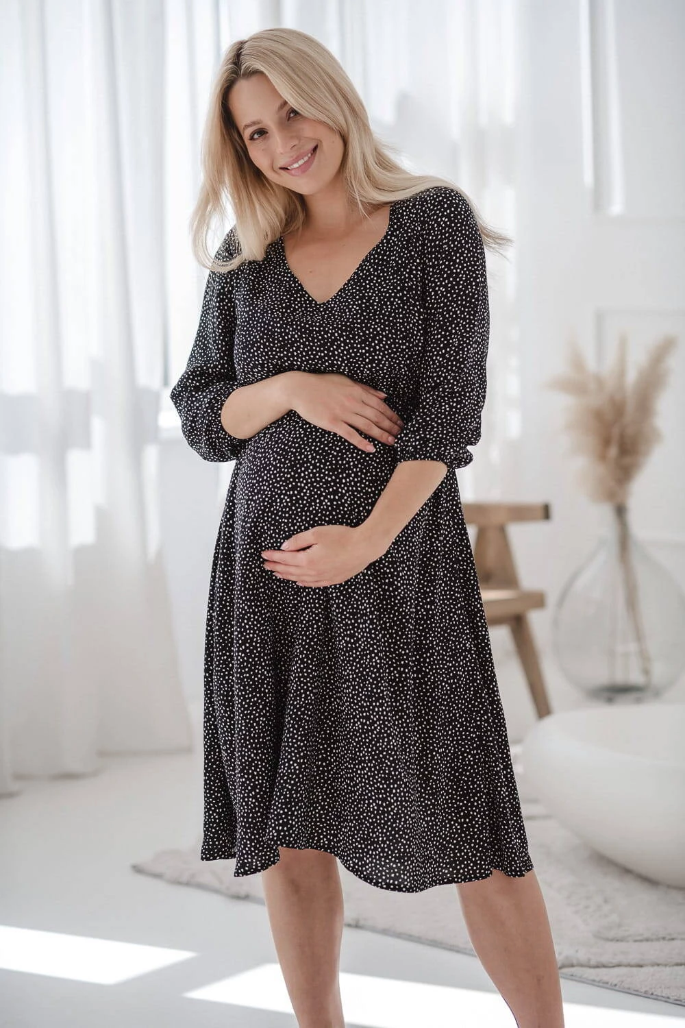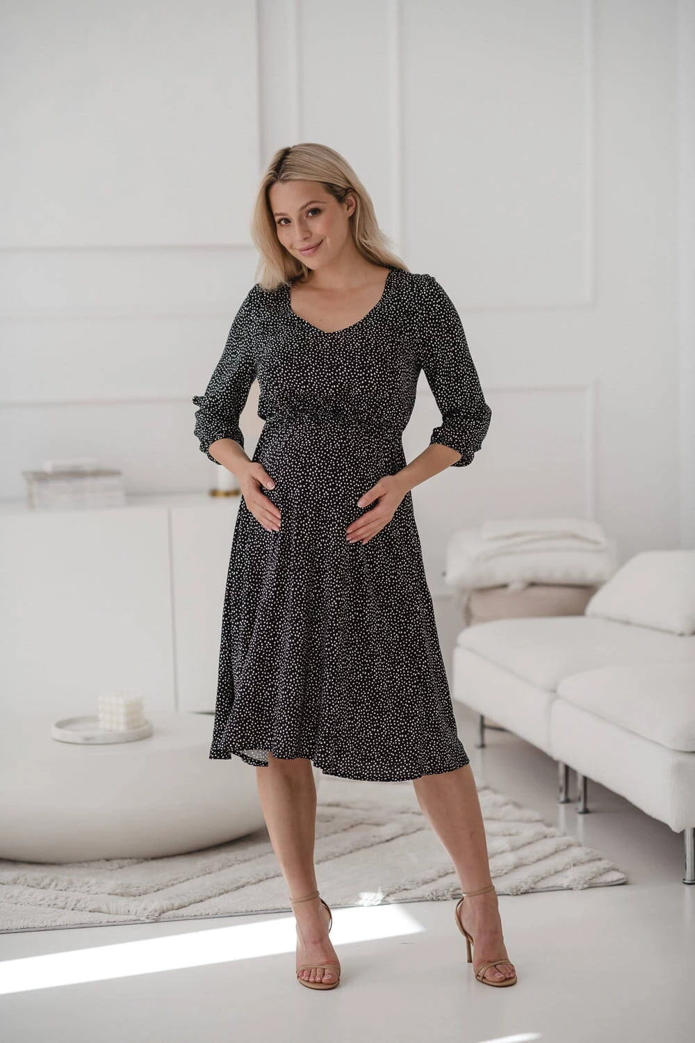 Krásné těhotenské šaty na kojení Midi s 3/4 puntíkovanými rukávy v černé barvě