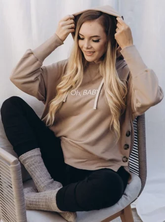 Poznejte těhotenskou mikinu v nadčasové kávové barvě od značky Latte mama. Prezentovaná těhotenská mikina s kapucí z měkké teplákoviny se skvěle hodí do chladnějších dnů. Těhotenskou mikinu zdobí výšivka: Oh, BABY! , má ve spodní části pěkné knoflíky, umožňující pohodlný a volný pohyb a přizpůsobí se těhotenskému bříšku od prvního do třetího trimestru a dále. Oversize střih pojme v těhotenství i to nejvýraznější těhotenské bříško a módní béžový odstín dodá budoucí mamince šik v těhotenství i po něm. Funkční mikina je vyrobena z prodyšných látek testovaných dle Oeko-Tex Standard 100 , díky čemuž je příjemná na dotek pro maminku i dítě. Celý proces výroby těhotenských mikin probíhá v Polsku, což zaručuje nejvyšší kvalitu zpracování.