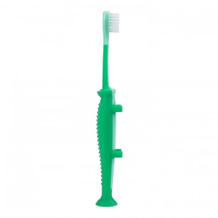 Zubní kartáček pro děti je upraveno pro malá ústa, pomáhá rozvíjet dovednosti potřebné k samostatnému čištění zubů. Má měkké štětinypro jemné kartáčování. Krokodýlí nohy pomáhají malým prstům pohodlně držet zubní kartáček. Přísavka v základně bezpečně drží kartáč ve vzpřímené poloze. Nezapomeňte kartáček před a po každém použití opláchnout teplou vodou. Zubní lékaři doporučují výměnu každé tři měsíce z hygienických důvodů. Pro děti po dobu 12 měsíců life