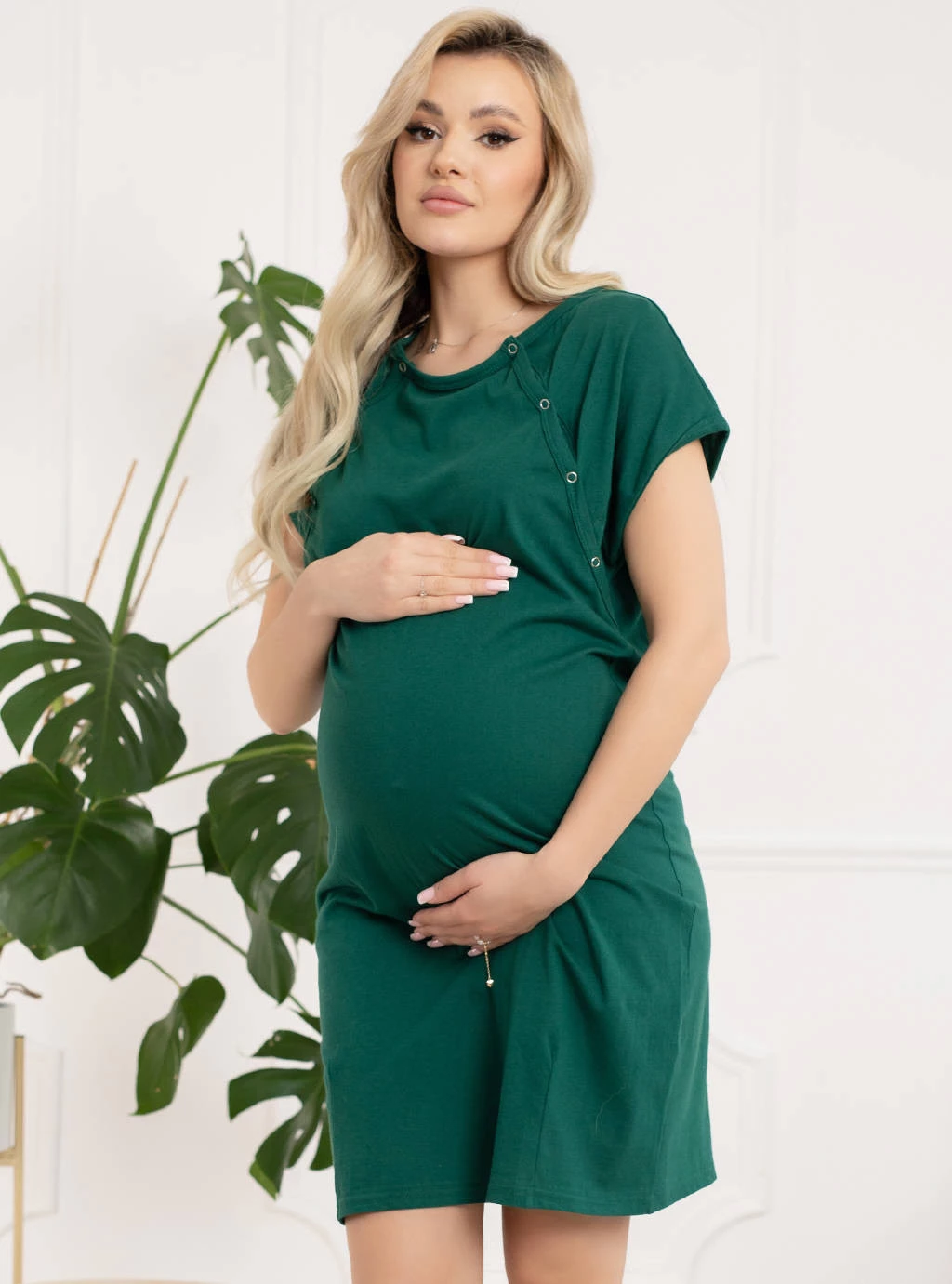 Těhotenská košile v lahvově zeleném odstínu, rozepínací na obou stranách hrudníku a po celé délce zad pro vaše pohodlí během pobytu v nemocnici.
