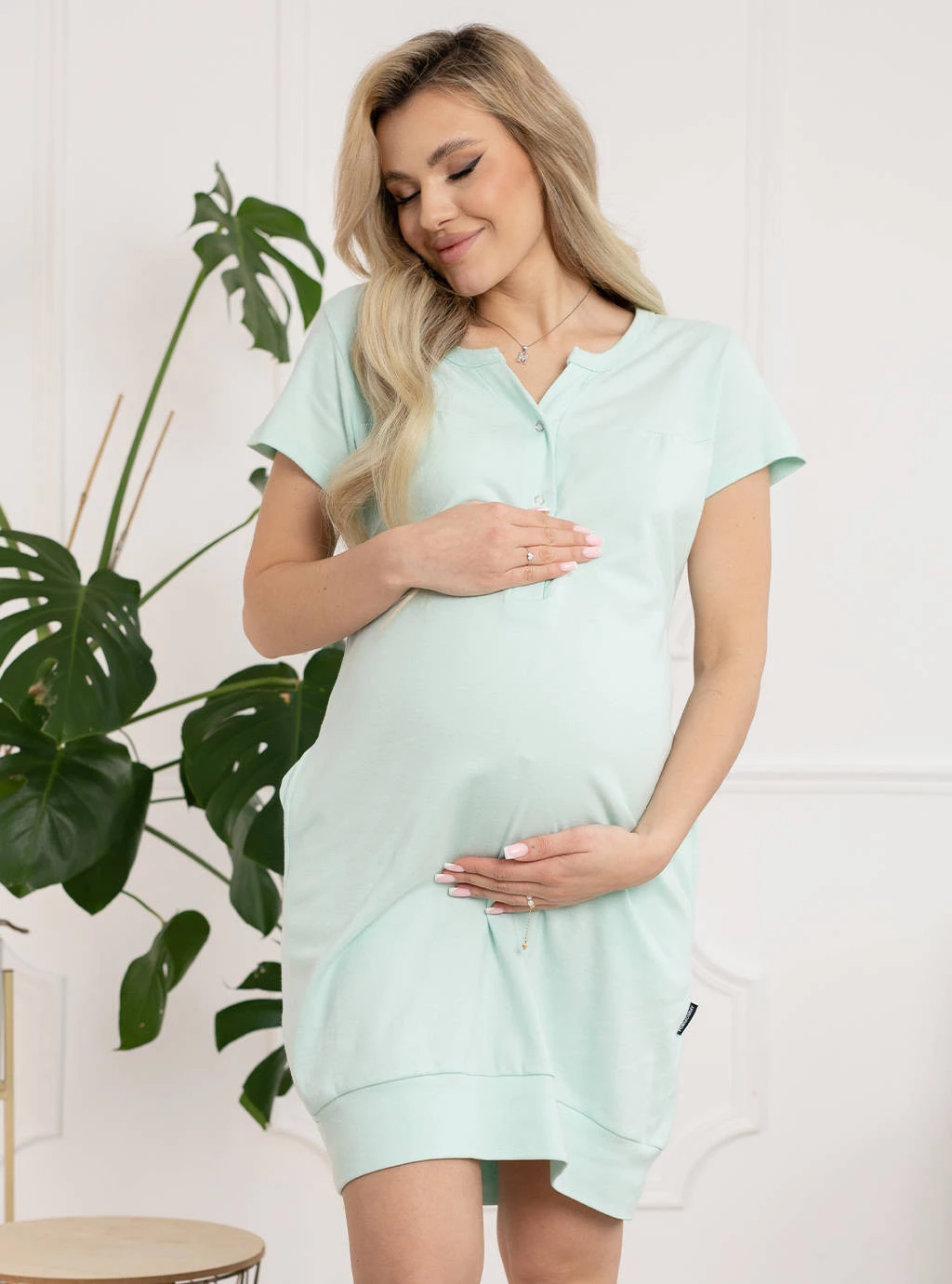 Prémiové noční košile Sunny jsou těhotenské košile pro těhotné ženy šité v Polsku z nejjemnější bavlny. Těhotenská kojicí košile v krásném pastelovém odstínu máty s drobnými záhyby v oblasti prsou a příjemným žebrovaným lemem. Kojicí košile má všité kapsy pro uložení různých těhotenských potřeb. Tvarem připomíná bombarďáky a snadno nahradí různé těhotenské oblečení, od halenek po tuniky. Kojicí košile se zapínáním bez niklu je pro maminku i miminko nealergická.