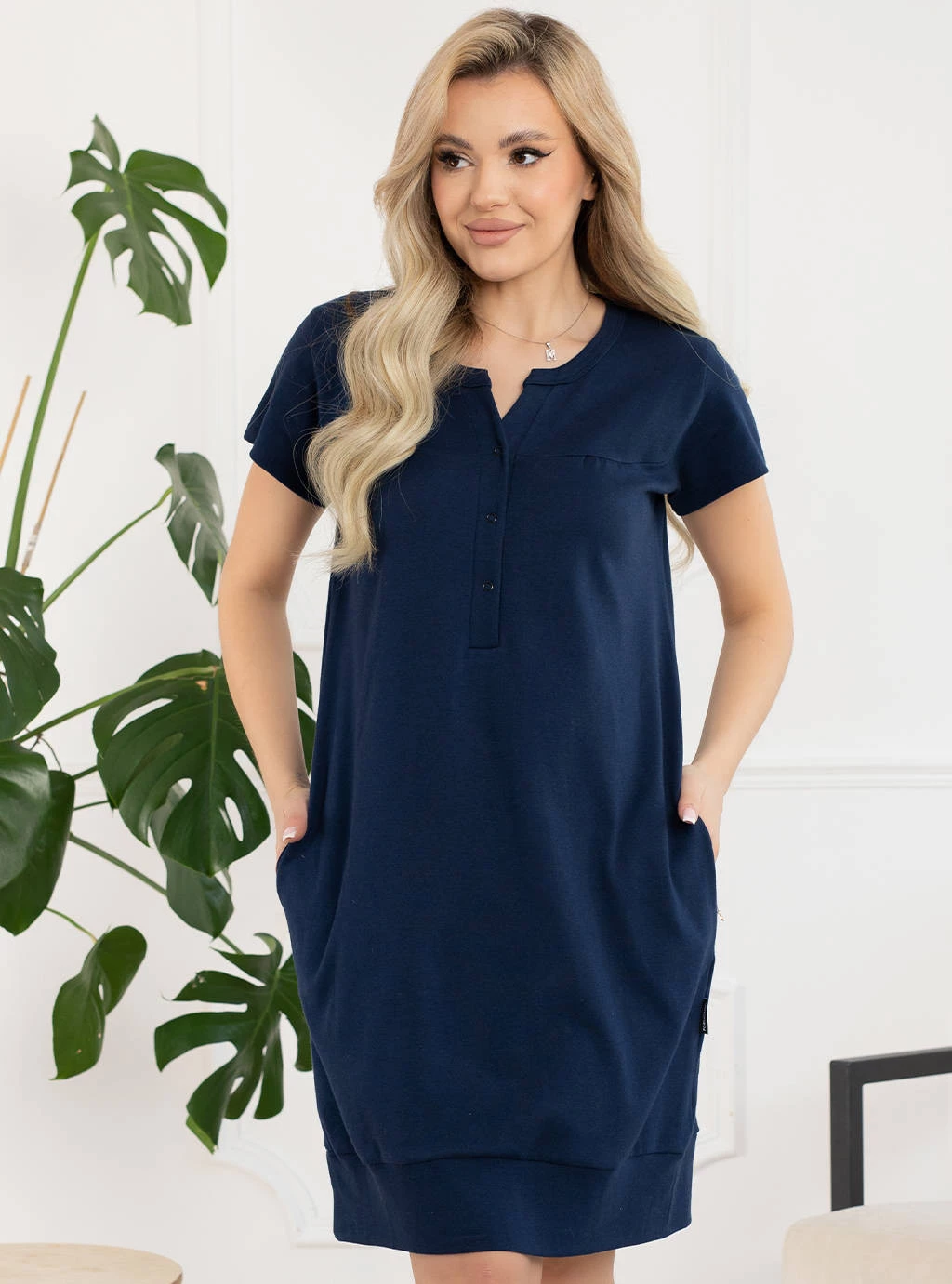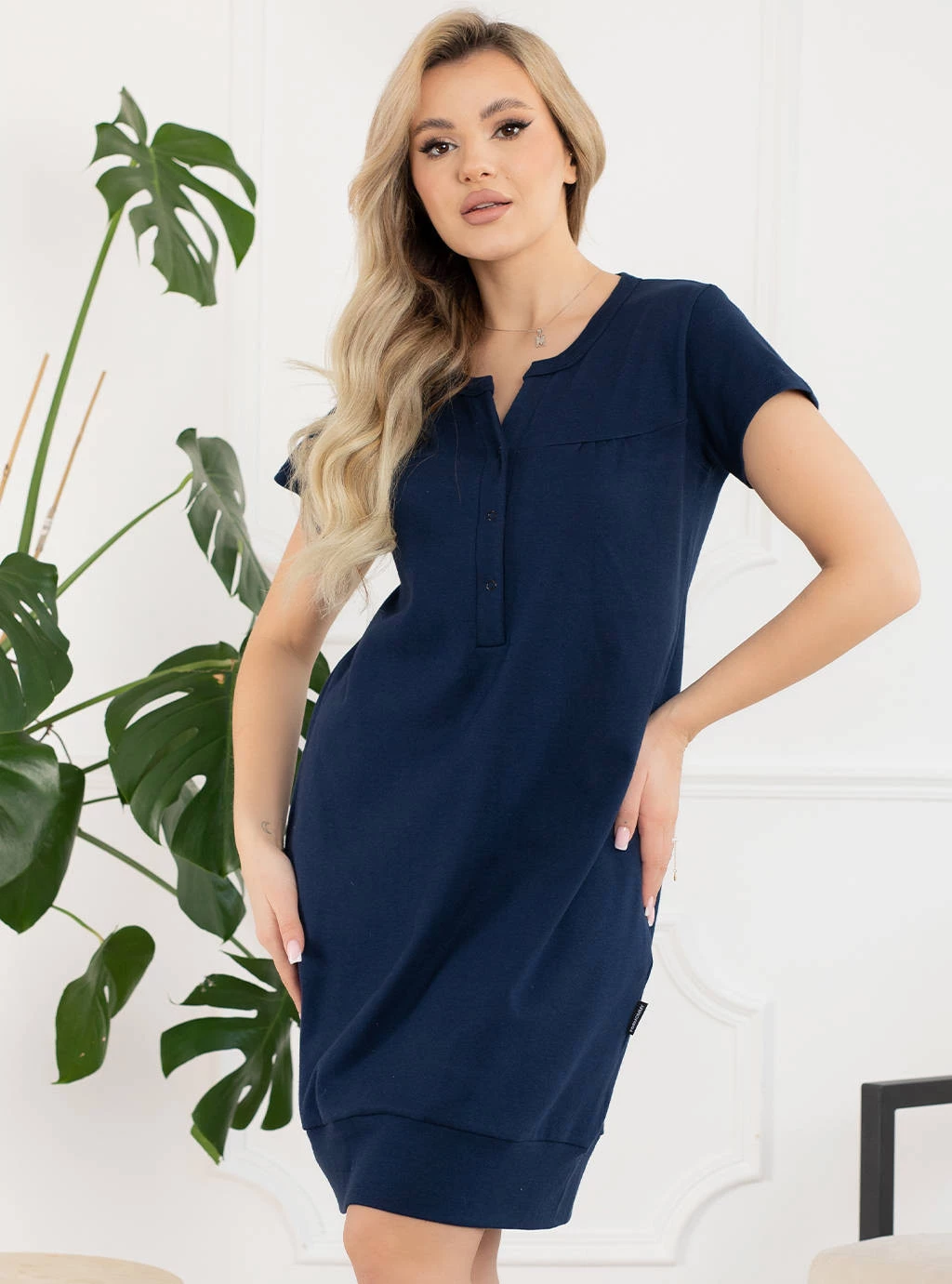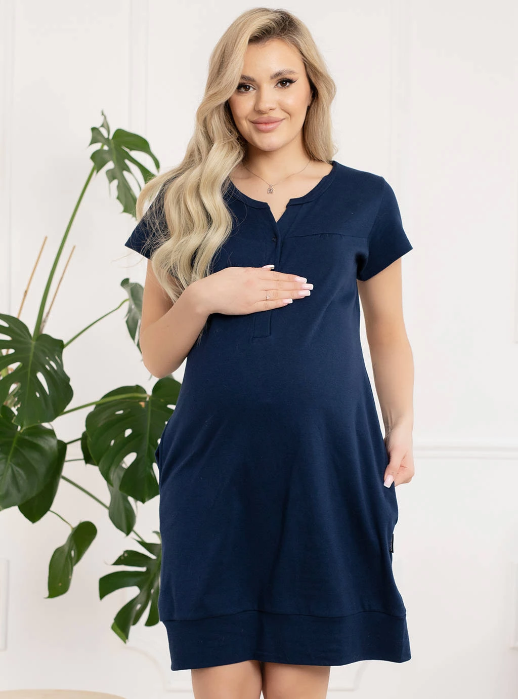 Tmavě modrá noční košilka Sunny byla vyrobena v Polsku polskými výrobci. Kojenecká košile se uprostřed rozepíná na patentky, vrchní díl je ušitý s pohodlným sedlem a malými záševky. Spodní část je lemována lemovkou ve stejné barvě, která jí dodává na půvabu a připomíná pohodlnou tuniku s bomber střihem. Snadno nahradí šaty nebo jiné těhotenské oblečení. Další výhodou této jedinečné noční košile pro kojící a rodící ženy jsou všité kapsy pro uložení vašich těhotenských nezbytností.