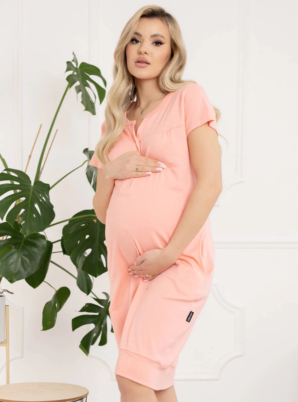 Těhotenská košilka v pastelovém odstínu meruňkové barvy s pěkným střihem podobným bombarďákům. Košilka Sunny má ve spodní části žebrovaný lem a v horní části krásné záševky. Těhotenské košile v midi délce z kolekce Sunny jsou v jemných pastelových nebo klasických barvách, vyrobené z bavlny prvotřídní kvality pro vaše pohodlí, s kapsami a bezniklovými patentkami pro snadnější kojení. Výběrem meruňkové Sunny snadno nahradíte těhotenské oblečení, jako jsou šaty nebo tunika, a stále budete vypadat atraktivně a žensky. Vyzkoušejte komfort a pohodlí bavlněných látek ještě dnes, vyberte si pastelové odstíny v našem internetovém obchodě a užívejte si midi Sunny na cestě do porodnice i během těhotenství.