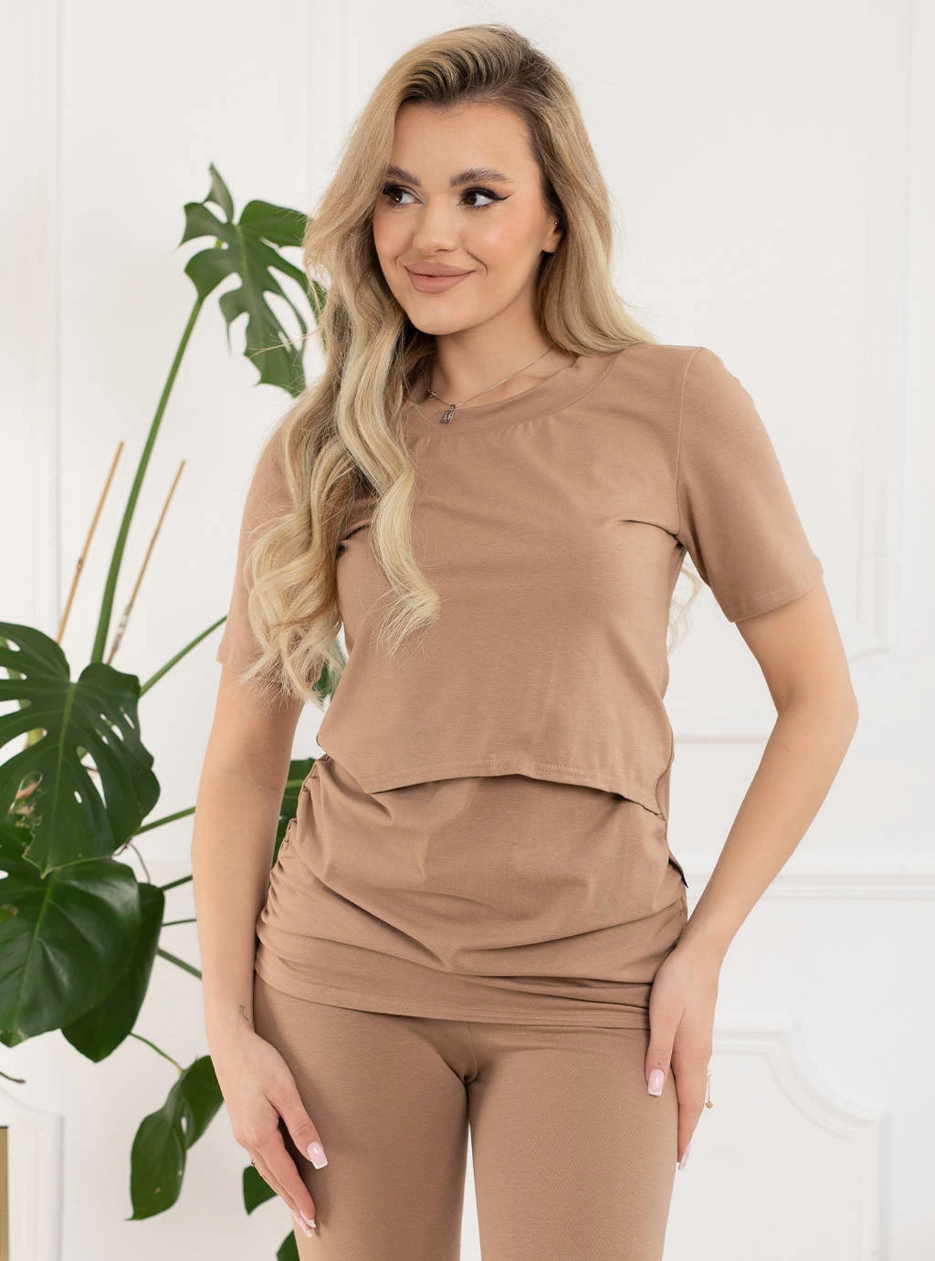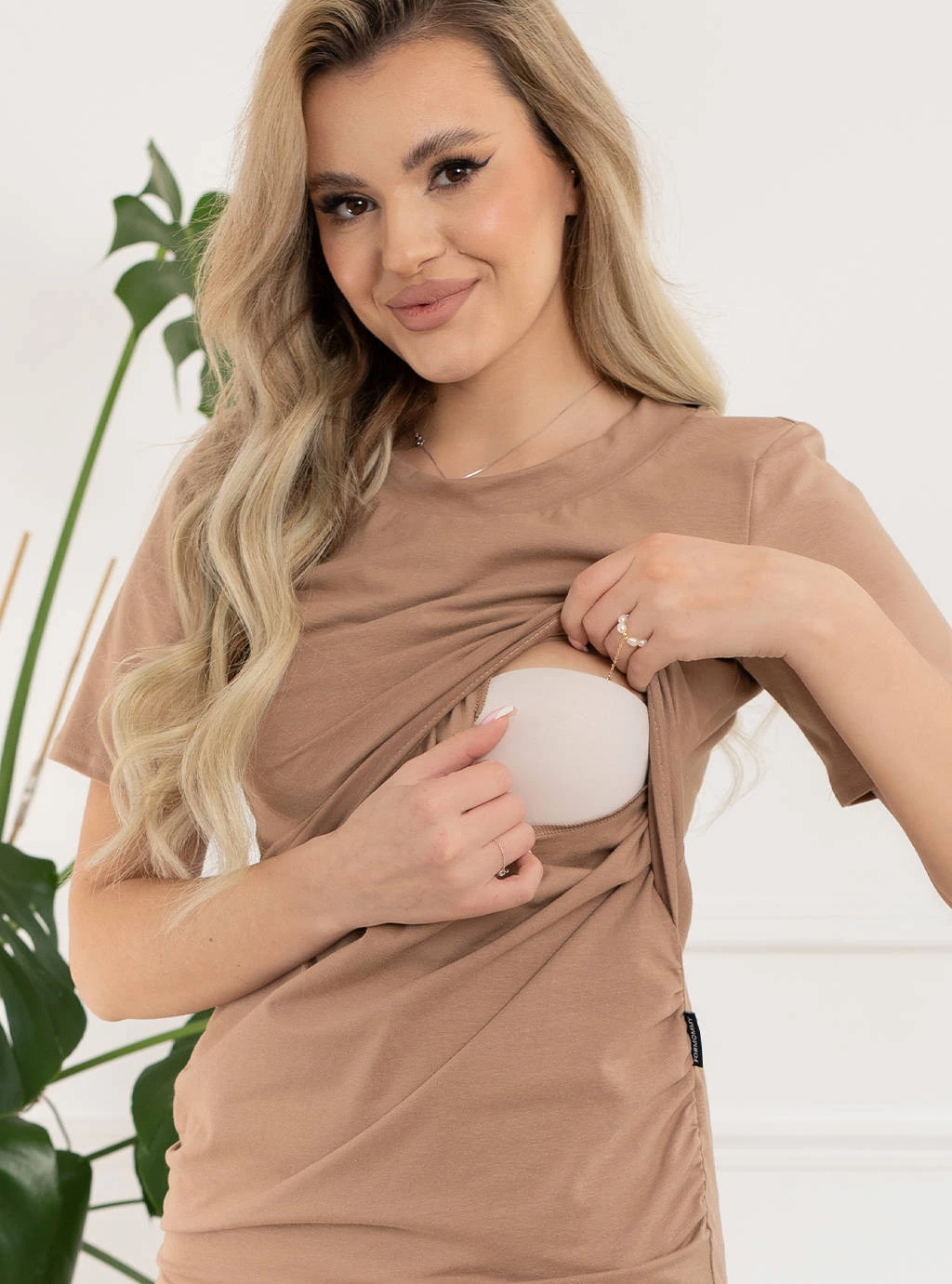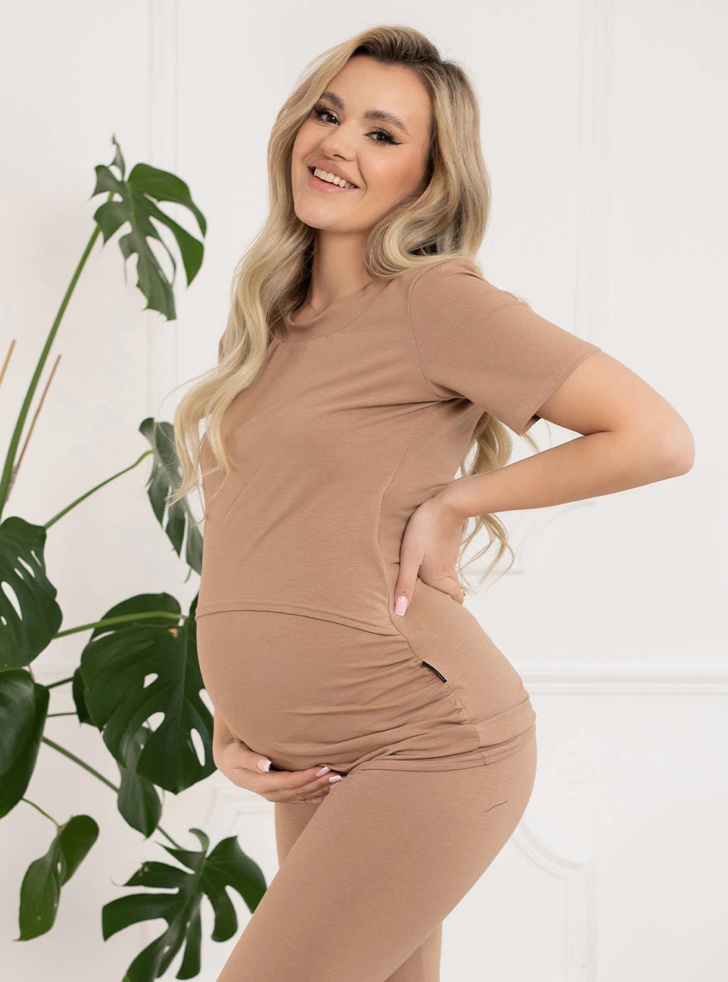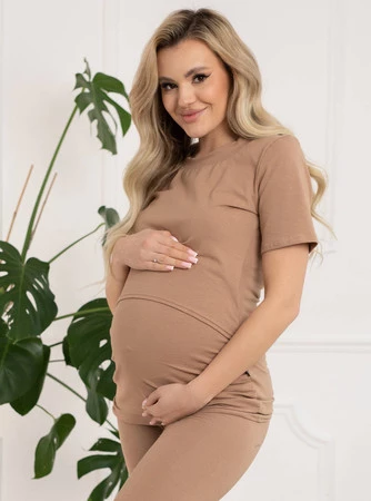 Tentočerné těhotenské tričko má krátké rukávy, klasický kulatý výstřih. Pod prsy má možnost kojení v podobě překrytí zakončeného na jedné straně gumičkou. To matkám usnadňuje diskrétní a pohodlné krmení dítěte, aniž by musely odhalovat celé tělo. Přední část halenky je o něco delší, takže si můžete být jisti, že zakryje celé bříško.