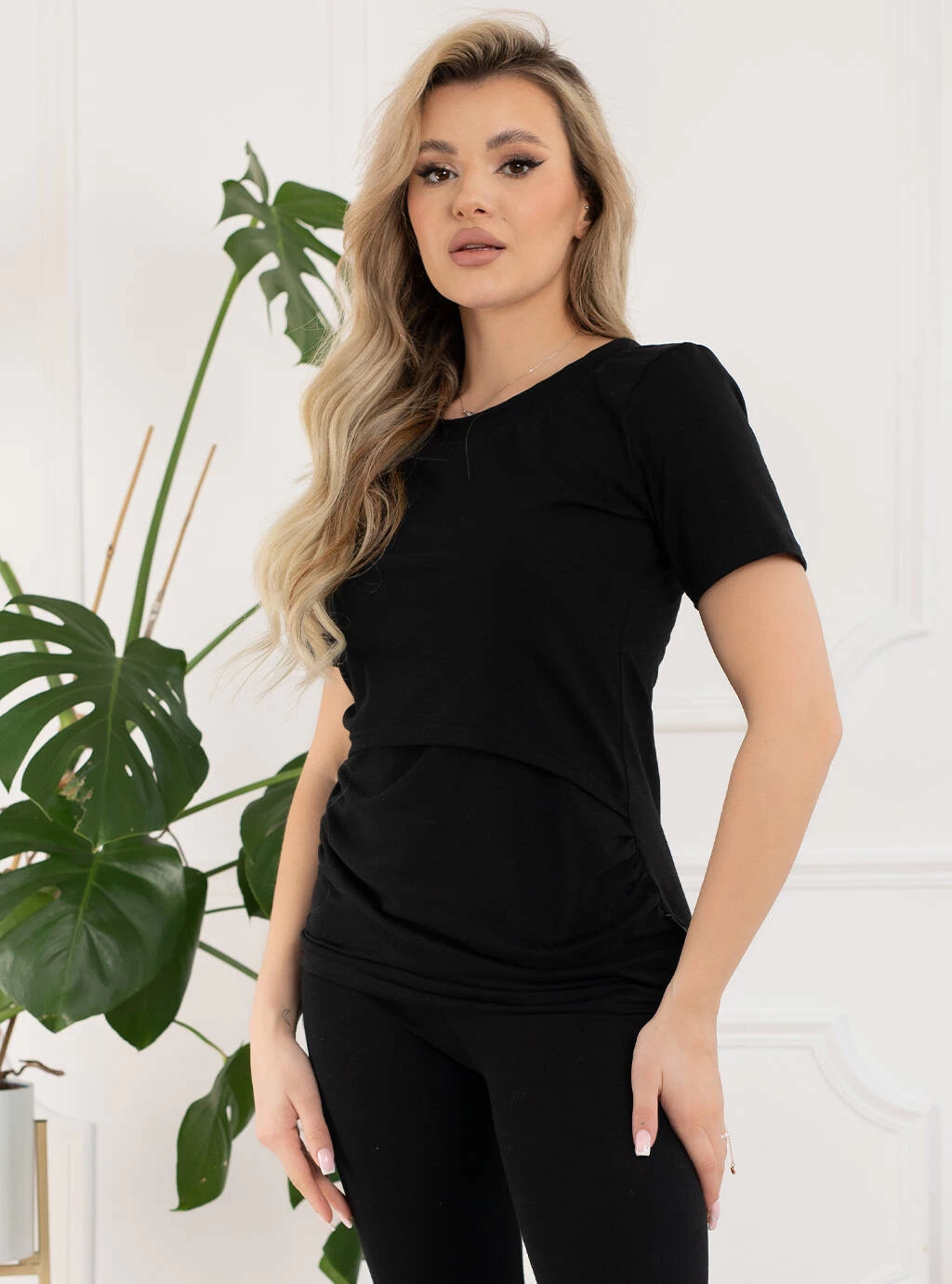 Tentočerné těhotenské tričko má krátké rukávy, klasický kulatý výstřih. Pod prsy má možnost kojení v podobě překrytí zakončeného na jedné straně gumičkou. To matkám usnadňuje diskrétní a pohodlné krmení dítěte, aniž by musely odhalovat celé tělo. Přední část halenky je o něco delší, takže si můžete být jisti, že zakryje celé bříško.