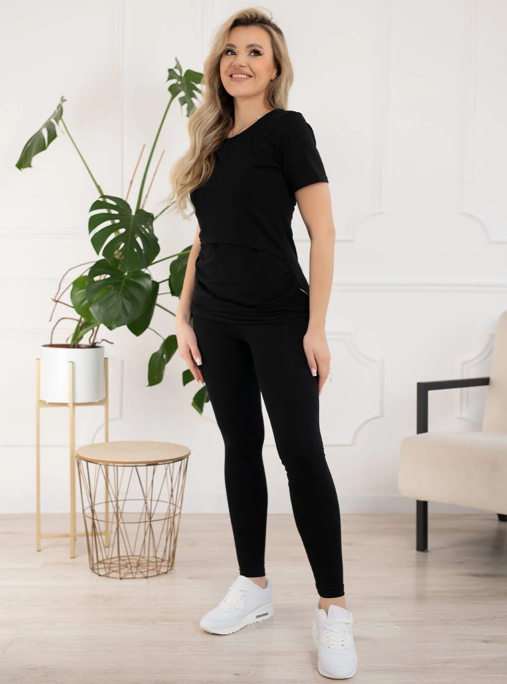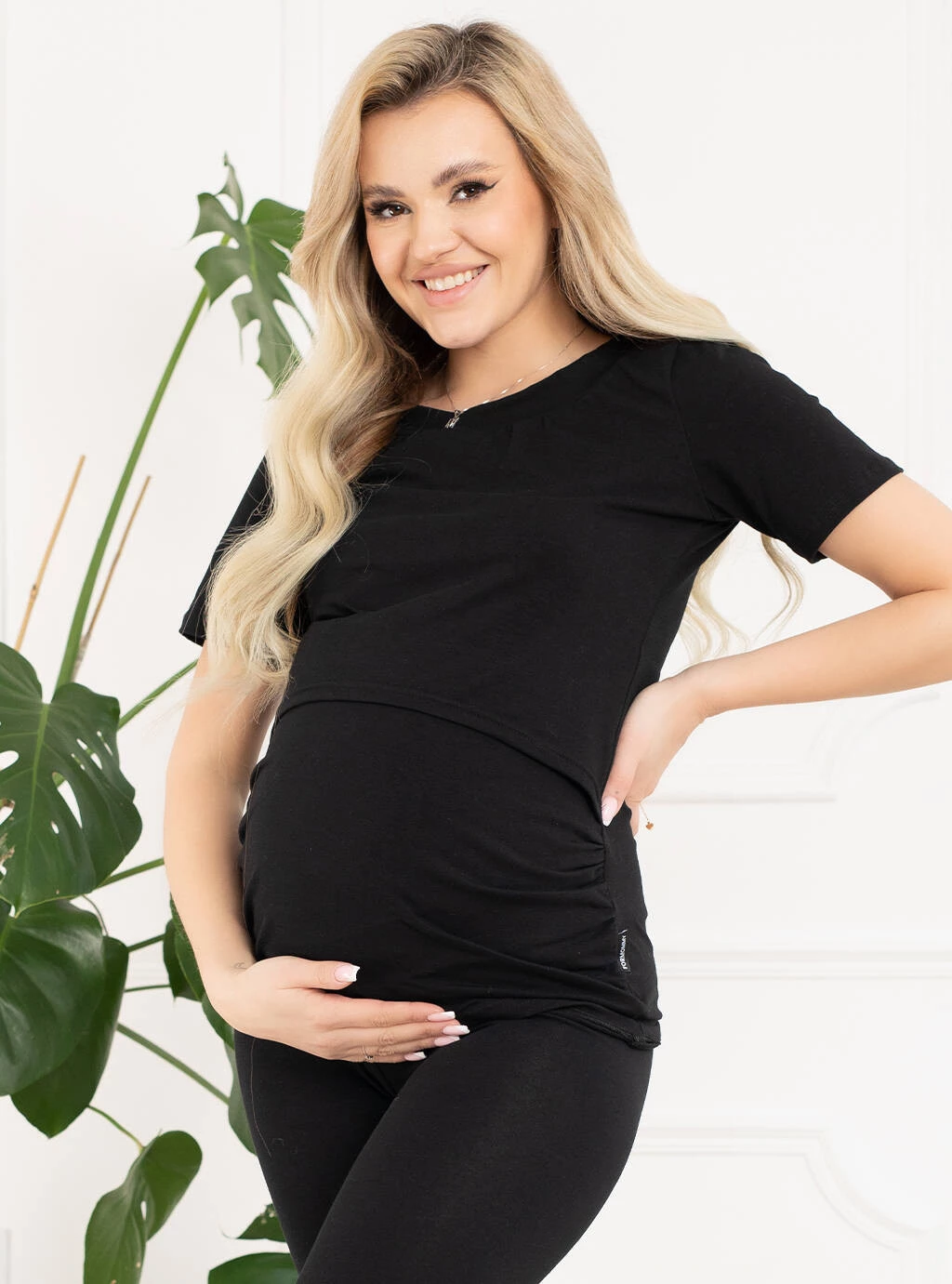 Tentočerné těhotenské tričko má krátké rukávy, klasický kulatý výstřih. Pod prsy má možnost kojení v podobě překrytí zakončeného na jedné straně gumičkou. To matkám usnadňuje diskrétní a pohodlné krmení dítěte, aniž by musely odhalovat celé tělo. Přední část halenky je o něco delší, takže si můžete být jisti, že zakryje celé bříško.