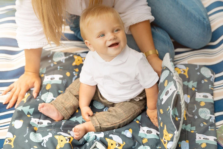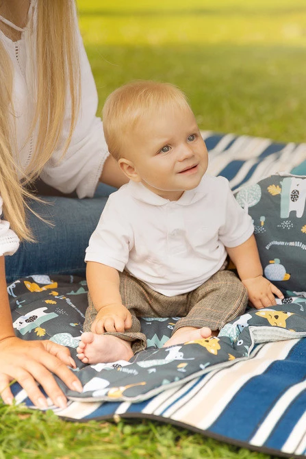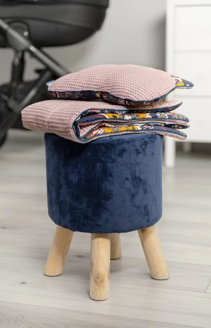 Souprava do kočárku Wafel skládá z polštáře (36x28 cm) a přikrývky (56x76 cm). Díky těmto rozměrům je souprava ideální do kočárku, postýlky nebo jako měkká podložka pro miminko. Uvnitř nachází antialergická výplň, která zajišťuje dostatečnou izolaci proti chladu. Samotný polštář může sloužit jako mazlíček. Set je vyroben ze 100% bavlny - na jedné straně je potisk a na druhé straně měkká bavlna s vaflovou strukturou, která dodává celému setu jedinečný vzhled.