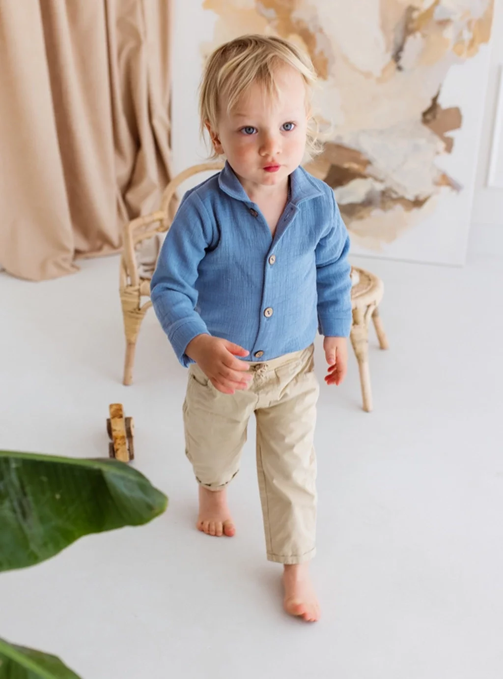 Modré kojenecké body pro kluka košilkového střihu a jemným límečkem. Kojenecká košilka má knoflíky na rukávech a dřevěné knoflíky na přední straně zajišťující snadné oblékání a svlékání miminka. Jedná se o unikátní kojeneckou výbavičku vyrobenou z měkké a na dotek příjemné 100% mušelínové bavlny zajišťující pohodlí a volnost pohybu. Antialergické patentky v rozkroku usnadňují kdykoliv výměnu plenky.