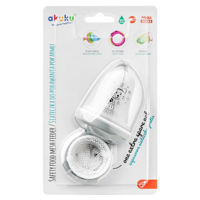 Síťky na servírování potravin "akuku" se používají k bezpečnému servírování nejen čerstvé ovoce, ale také zeleninu, sýr nebo sušenky. Zvláště užitečné při přechodu na pevnou stravu. Eliminuje riziko udušení nepřesně ukousnutými kousky jídla. Ideální pro malé dětské ruce. Skvělé na procházky nebo cestování. Součástí je krytka chránící síťku před znečištěním. Při prořezávání zoubků ji lze použít i jako kousátko. Snadné čištění. Včetně náhradní síťoviny. Zcela bez bisfenolu A (0 % BPA).