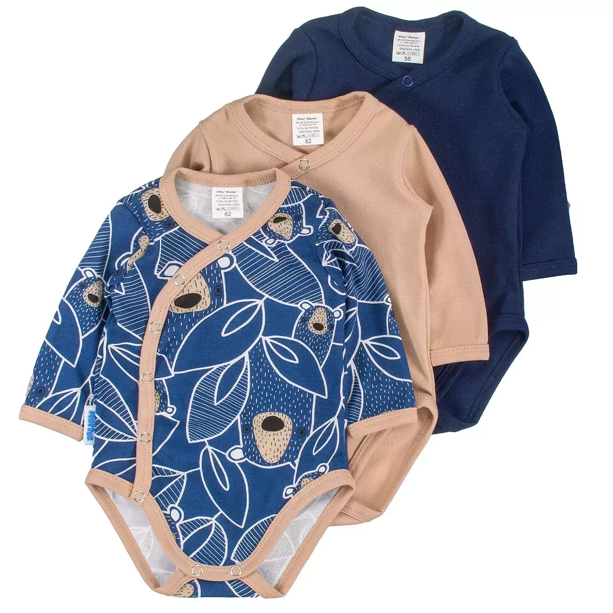 První psaníčko je krásné tmavě modré a béžové body s veselými a milými medvídky Koka, druhé je tmavě modrý tradiční outfit a třetí je béžová klasika. Modely z kolekce Matrex v této sadě jsou skvělým materiálem, tedy 100% bavlnou , která je příjemná na dotek a pečuje o dětskou pokožku. Tradiční body je oblečení nejblíže k tělu dítěte, které se zapíná na patentky bez obsahu niklu v rozkroku, které usnadňují přístup a výměnu plenky, když to miminko potřebuje, například na procházce. Obálkové body zapínané po celé délce na patentky bez obsahu niklu usnadní oblékání malého dítěte, což je jistě užitečné zejména v první fázi života dítěte, kdy je oblékání poměrně často nutné.