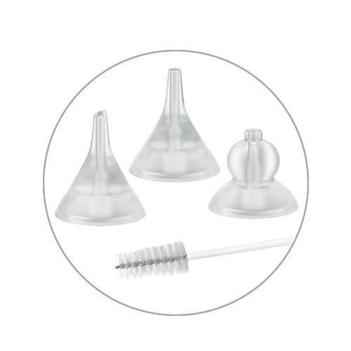 Ultra miękkie 3 silikonowe nasadki, które można dostosować do rodzaju wydzieliny i wieku niemowlaka. W zestawie dodatkowa szczoteczka czyszcząca. Gwarancja higieny i dopasowania do potrzeb najmłodszych.