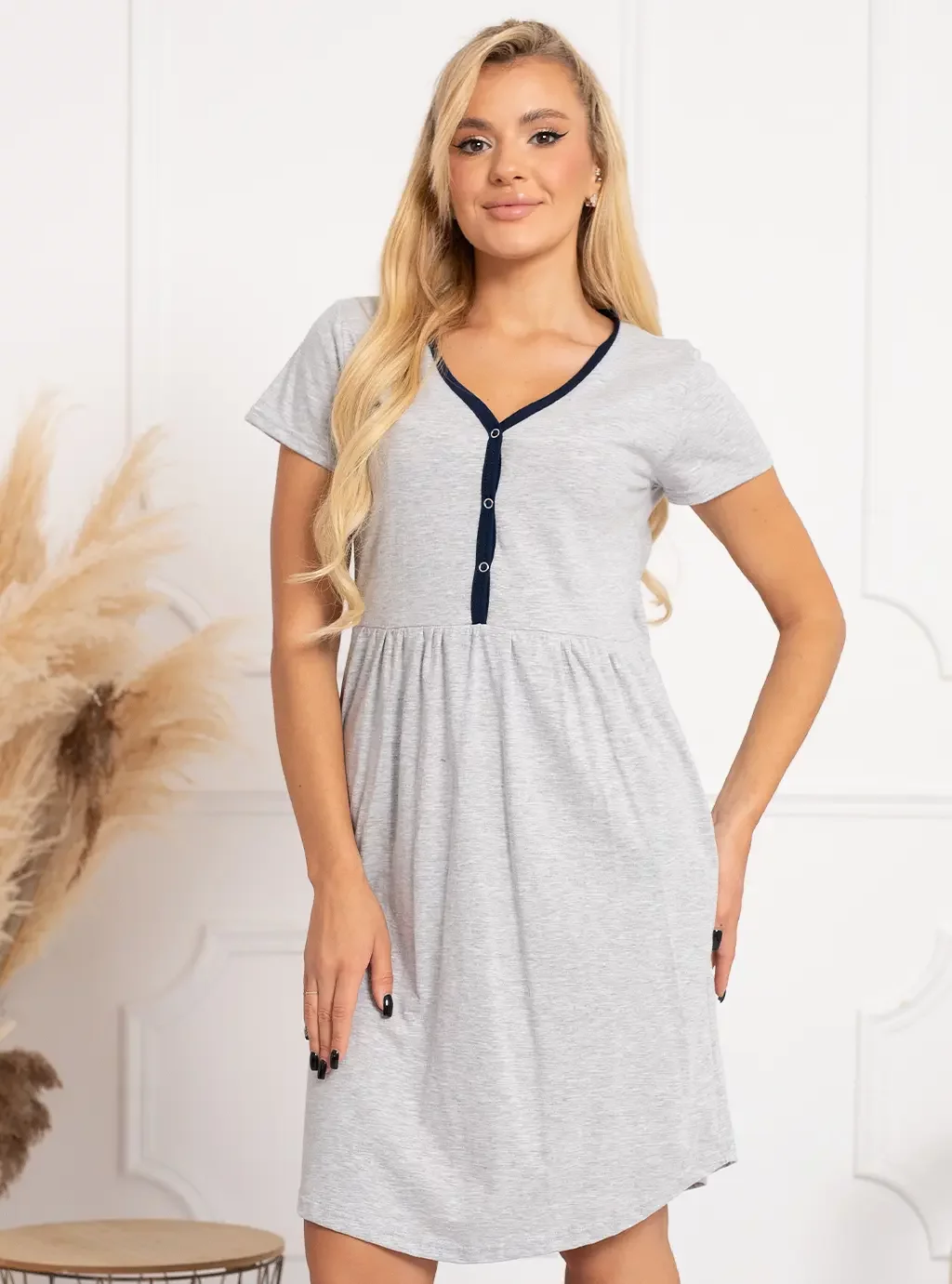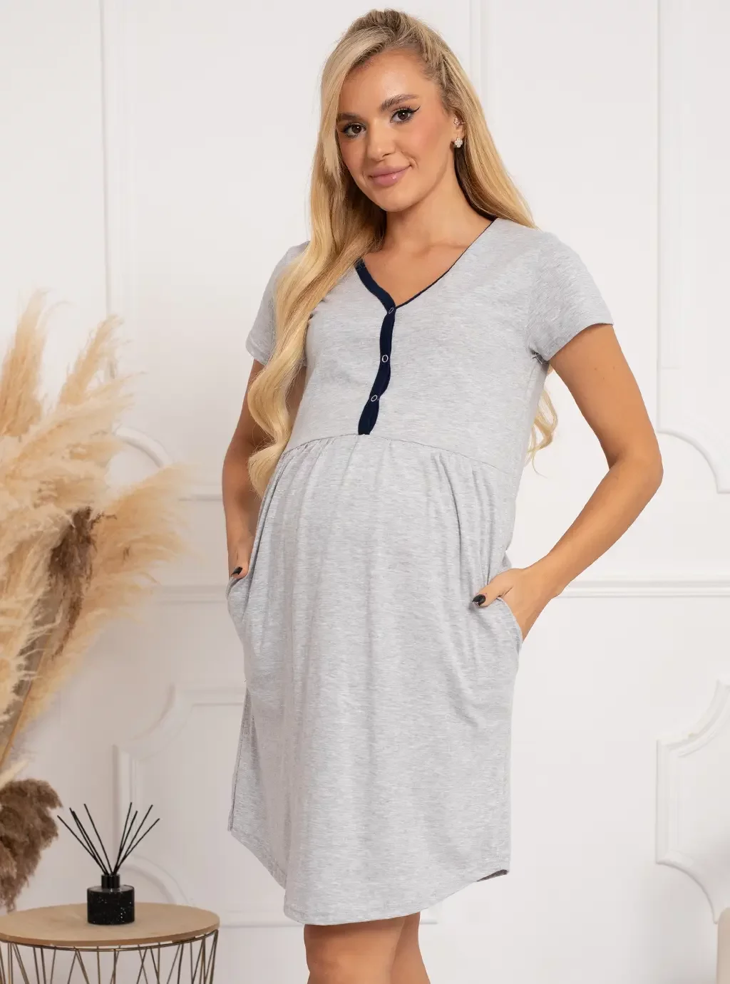 Bavlněné noční košilky z kolekce košil Ismena od značky Formommy s krátkým klasickým rukávem jsou perfektní volbou v těhotenství a kojení. Tyto dokonalé noční košilky umožňují jednoduché a nekomplikované krmení a především neomezují budoucí maminku v pohybu, když se těhotenské bříško tak rychle mění. Dobře zvolená košilka usnadní noční krmení novorozence a zajistí budoucí mamince pohodlí v těhotenství. Prezentovaný model košile Ismena je pěkně zpracovaná šedá košile s tmavě modrým lemováním a nabíráním pod prsy pro přizpůsobení těhotenskému bříšku. Bezniklové patentky, protože takto se noční košilky této kolekce rozepínají, nezpůsobí mamince ani miminku žádné alergické reakce při krmení.