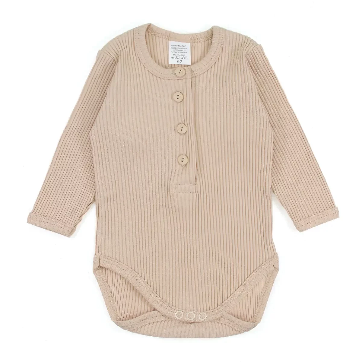 Představujeme Vám kojenecká body pro kluky a dívky z žebrovaného materiálu v tradiční béžové barvě. Dětské body s dlouhým rukávem, bezpečné pro citlivou pokožku vašeho miminka, zapínání na patentky bez obsahu niklu a dřevěné knoflíky, takže miminko můžete snadno svléknout a obléknout. Béžové body s módním pruhovaným vzorem se skvěle hodí do šatníku vašeho dítěte . Vyberte si stylové kojenecké body zapínané na pěkné dřevěné knoflíky a svlékání miminka a přebalování bude jednoduchá záležitost.