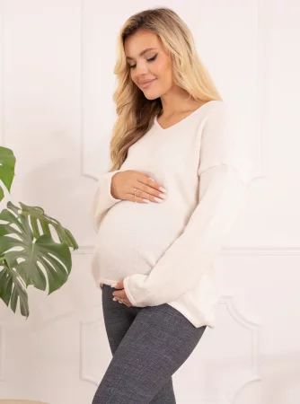 Investujte nyní do pohodlných svetrů na chladnější dny nebo zimní večery. Dokonalý svetr s dlouhým rukávem s přídavkem hřejivé vlny je hitem! v těhotenství, ale i na období před a po. Jemný ecru svetr je typický ležérní styl a může vás provázet v každé fázi těhotenství, protože klasické svetry jsou modelem, který nikdy nevyjde z módy a může úspěšně posloužit jako volnější těhotenský svetr pro budoucí maminky. Stylové dámské svetry se hodí k džínám nebo sukni a nahradí klasické těhotenské oblečení v každé fázi těhotenství.