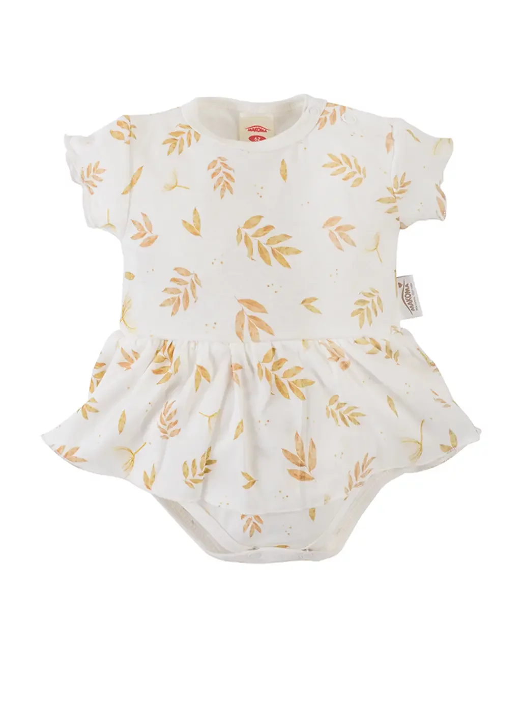 Velmi pěkné řešení pro holčičku - klasický, dokonalý outfit - šaty se zlatými listy z kolekce Li&Lu. Dívčí body, bezpečné pro citlivou dětskou pokožku, zapínané na patentky bez obsahu niklu kolem krku a rozkroku, jsou jednoduchým řešením, které usnadní oblékání a svlékání vašeho miminka. Pěkný nápad na letní styling v teplých dnech.