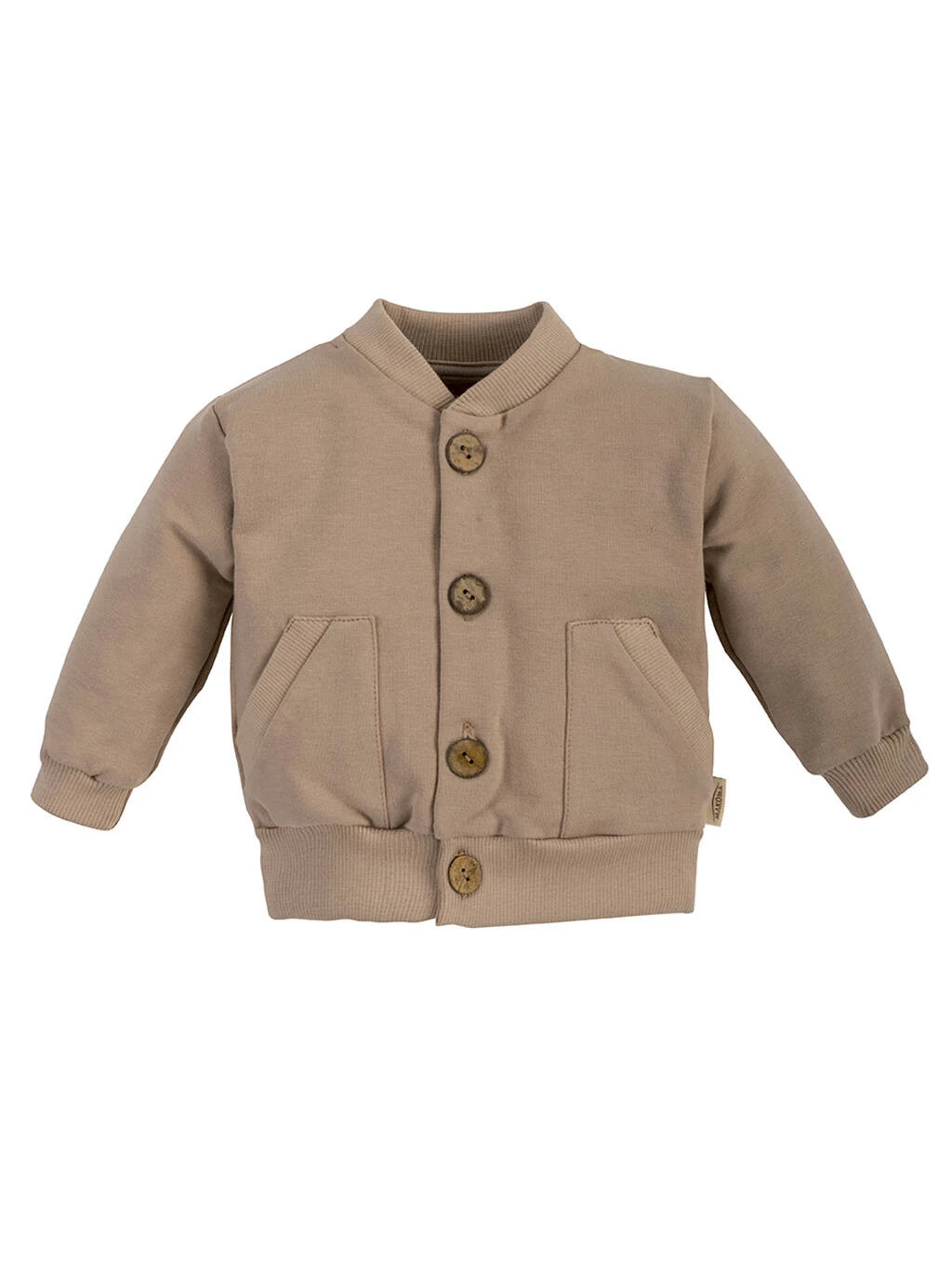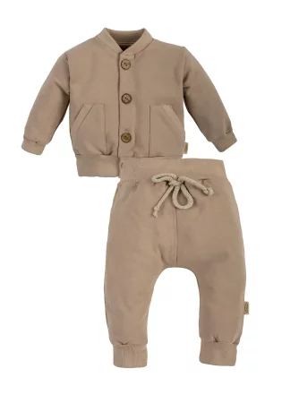 Pěknou soupravou jsou hotové soupravy pro kluky v barvě latte: kojenecké tepláky s neškrtícím pasem a bomber mikina zapínaná na dřevěné knoflíky. Miminka má všitý nápadný stojáček a 2 okouzlující kapsy. Tepláková souprava Joy je perfektní sada oblečení pro každého kluka. Oblečení vyrobené z bavlny pečuje o citlivou pokožku vašeho miminka.