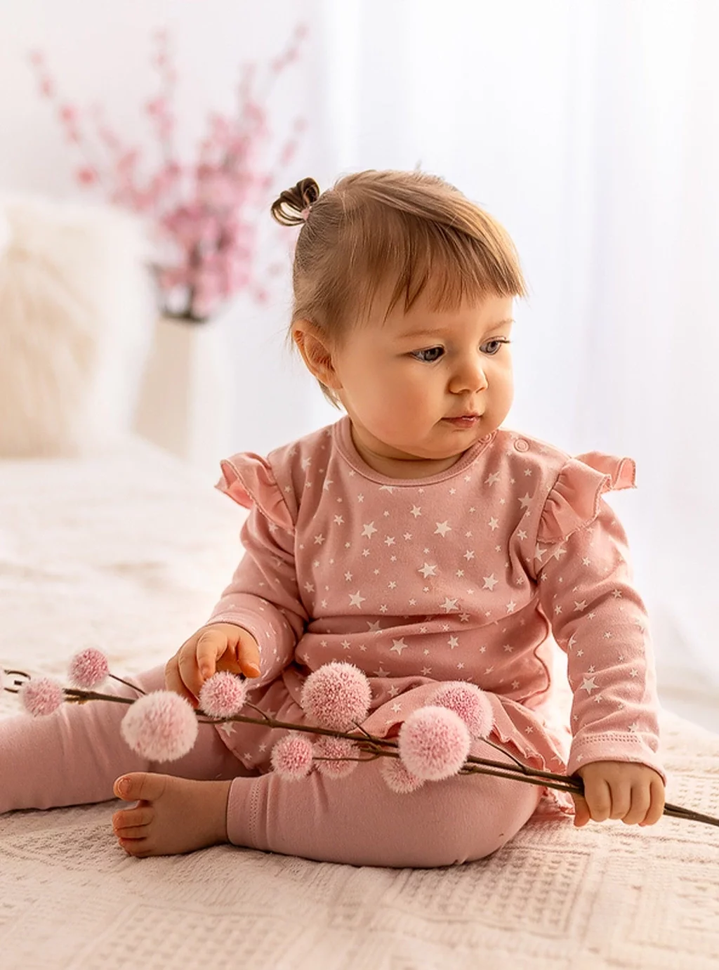Skvělý nápad pro miminko nebo větší holčičku - dokonalý tradiční outfit, tedy pudrově růžová tunika s drobnými hvězdičkami zakončená volánem na rukávu a dole. Dívčí tuniky, bezpečné pro jemnou dětskou pokožku, zapínané na patentky bez obsahu niklu kolem krku, jsou jednoduchým řešením, které usnadní oblékání a svlékání vašeho dítěte. Pěkný stylingový nápad pro chladné dny.