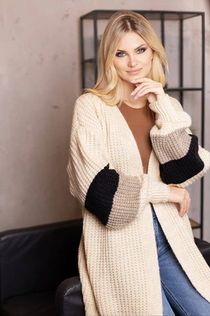Perfektní béžový svetr na podzim a zimu s barevnými pruhy na volných rukávech - to je nejen skvělý outfit, ale i oblečení, které s vámi dlouho zůstane. Pěkný doplněk do šatníku každé módní ženy, stylový dlouhý cardigan se bude skvěle hodit i v těhotenství, protože tento dámský svetr sedne na těhotenské bříško. Náš krásný, měkký dámský svetr si můžete zakoupit již dnes a užívat si jeho výhod po celý rok. Pohodlný svetr cardigan je dostupný v různých barvách na našem webu Formommy.