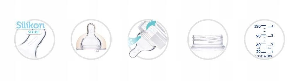 Antikoliková láhev EasyStart. Před prvním a každým dalším použitím láhev a její součásti důkladně umyjte a vydezinfikujte. Vložte na 5 minut do vroucí vody. Tím se zajistí hygiena. Čištění před každým použitím. Vaření a tvrdá voda mohou způsobit tvorbu usazenin. Všechny části důkladně omyjte čistou vodou, včetně míst, která nemusí být viditelná, ale kterými prošly zbytky jídla, abyste odstranili veškeré zbytky jídla. Po použití je třeba lahvičku se savičkou očistit od všech zbytků jídla, opláchnout, umýt a poté vydezinfikovat v parním/elektrickém sterilizátoru nebo ve vroucí vodě. Láhev lze mýt v myčce nádobí (max. temp. 65⁰C). Čištění dudlíku v myčce nádobí se nedoporučuje, protože mycí/čisticí prostředky mohou výrobek poškodit. Nepoužívejte k čištění antimikrobiální prostředky. Před každým použitím dudlík zkontrolujte a roztáhněte ve všech směrech. Dudlík pečlivě kontrolujte zejména tehdy, když má dítě zuby. Vyřazení při prvních známkách poškození nebo slabosti. Nedotahujte uzávěr savičky příliš pevně, protože by se savička nemusela správně odvzdušnit. Zkontrolujte, zda přívod netěsní zpod víčka. Neprorážejte ani nezvětšujte otvory dudlíku, mohlo by dojít k jeho poškození. Při ohřevu v mikrovlnné troubě dbejte zvýšené opatrnosti. Ohřívané jídlo vždy promíchejte, aby se teplota rovnoměrně rozložila, a před podáváním zkontrolujte teplotu. Pokud ohříváte jídlo v mikrovlnné troubě, nezapomeňte, že láhev musí být otevřená. Výrobek by se neměl vkládat do horké trouby nebo na plynový či elektrický sporák. Nenechávejte dudlík na přímém slunci, v teple nebo v dezinfekčních prostředcích ("sterilizační roztok") déle, než je doporučeno, protože by mohlo dojít k oslabení dudlíku. Z bezpečnostních a hygienických důvodů doporučujeme vyměnit dudlík za nový maximálně každé 2 měsíce. Láhev je vyrobena z polypropylenu.