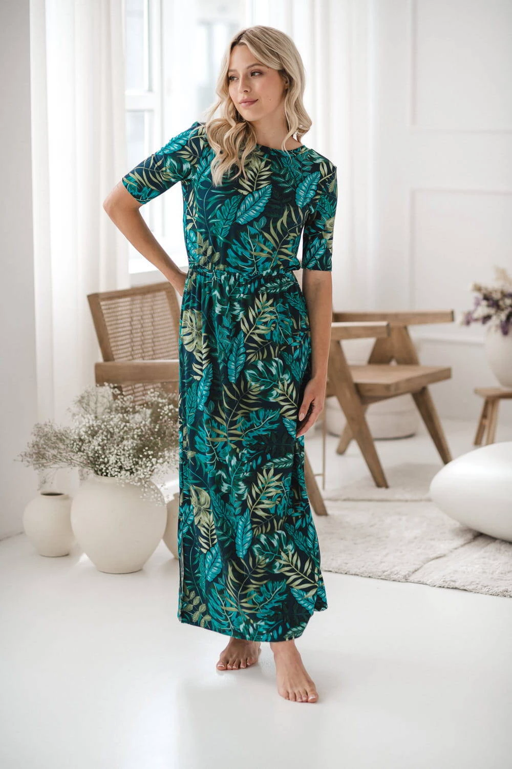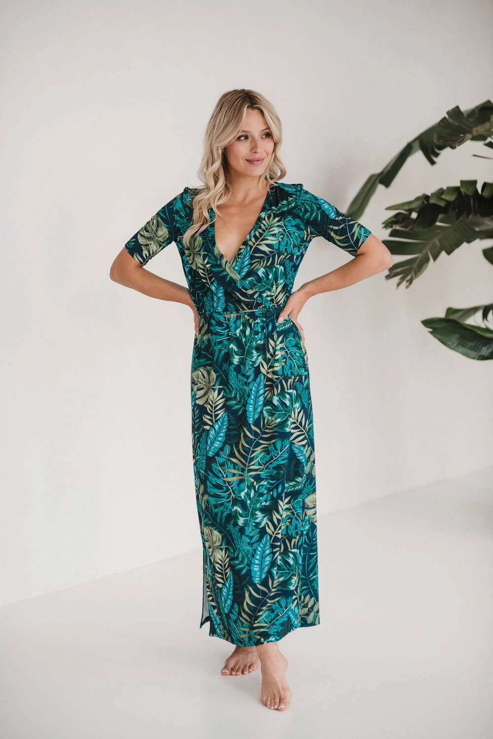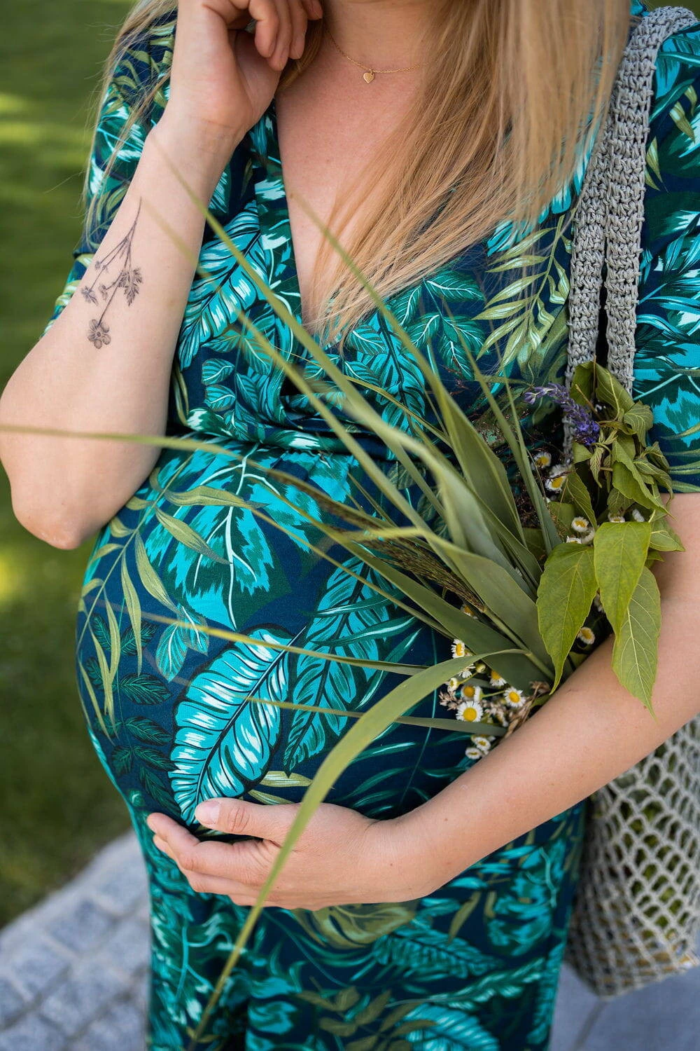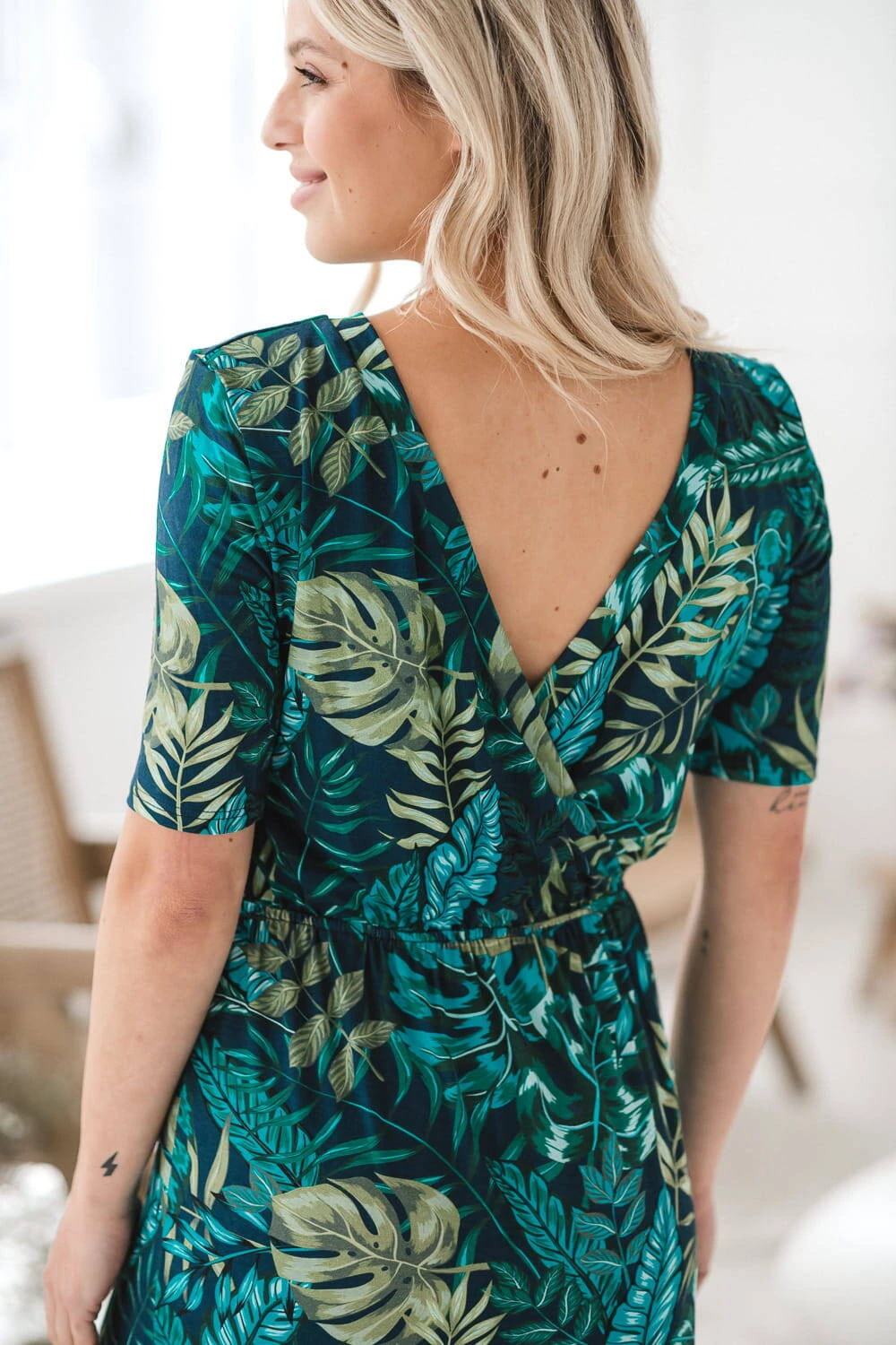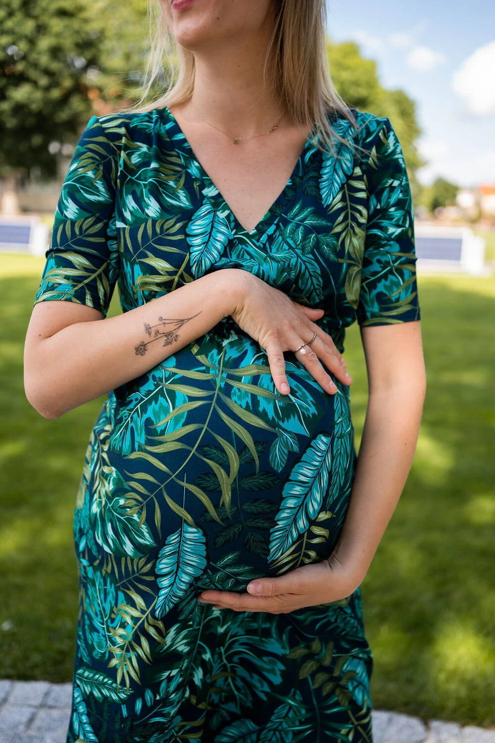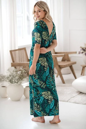 • Jemný vzor tropických listů dodává šatům jedinečný šarm a eleganci a stává se tak nepostradatelným prvkem šatníku čerstvé maminky, který si zamilujete od prvního nošení.
