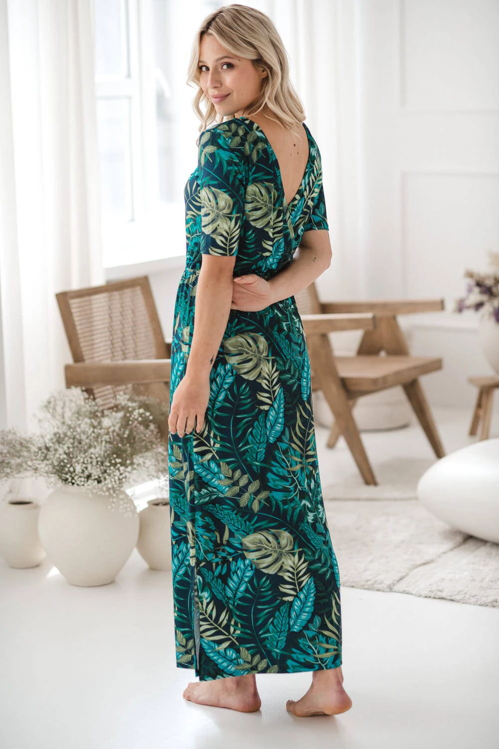 Doplňte svůj jedinečný těhotenský vzhled o báječnou kombinaci elegance a pohodlí s našimi těhotenskými a kojícími šaty z kolekce Two Ways LONG v hlubokém odstínu námořnické modré s módním vzorem tropických listů a krátkými rukávy. Tyto oboustranné šaty pro maminky se mohou během těhotenství stát jedinečným prvkem vašeho šatníku a poskytnout vám jedinečný styl a pohodlí v každé situaci během kojení.