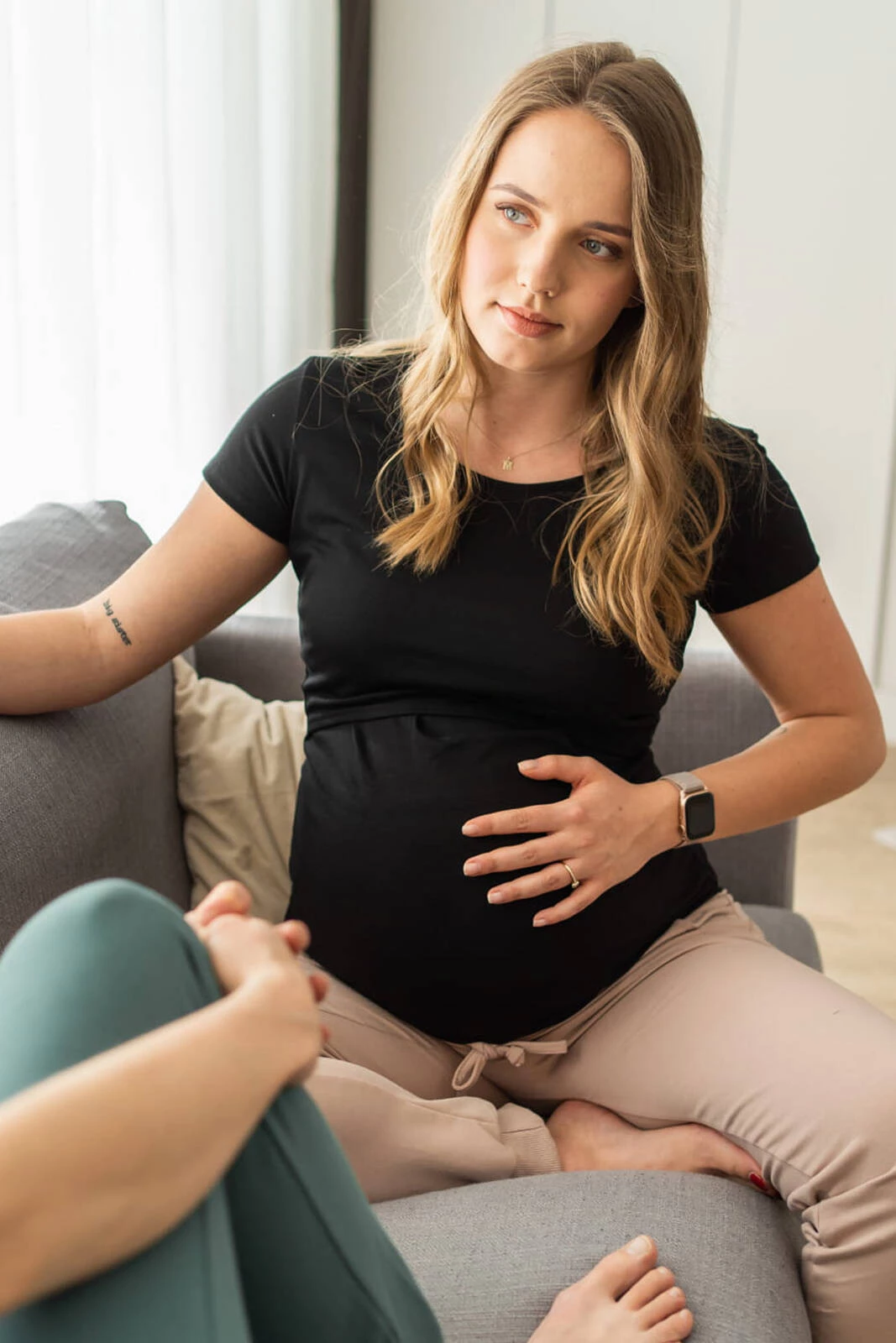 Naše černá těhotenská a kojící halenka s krátkým rukávem, Milk Shirt, je dokonalou kombinací elegance, pohodlí a funkčnosti. Tato unikátní a módní těhotenská halenka vyrobená z nejkvalitnějších materiálů zajišťuje komfort nošení v každé fázi těhotenství i po porodu. Díky své klasické černé barvě je ideální pro různé styly, jak pro každodenní, tak pro formálnější.