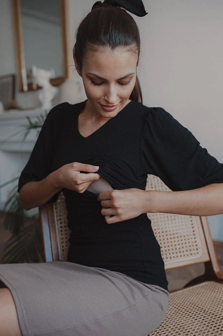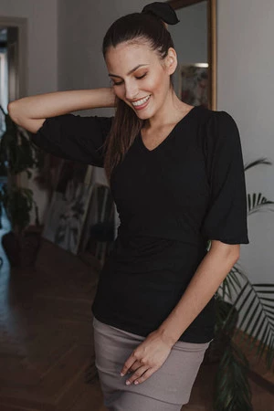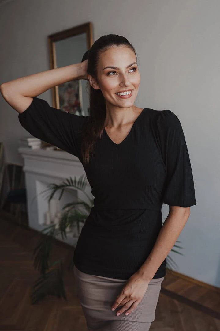 Zde je naše další elegantní nabídka pro budoucí maminky - dámská těhotenská a kojící halenka z měkkého žebrovaného úpletu z kolekce Milky Puff v černé barvě. Tato jedinečná těhotenská halenka pro kojící maminky je nejen stylovým doplňkem vašeho šatníku, ale také praktickým řešením v těhotenství a kojení. Perfektní řešení jak pro každodenní nošení, tak jako cool outfit s elegantními kalhotami nebo sukní do práce. Vyberte si pohodlí budoucích maminek a těhotných žen i módní střihy těhotenských halenek pro kojící maminky , bez kterých se módní těhotenský šatník neobejde.