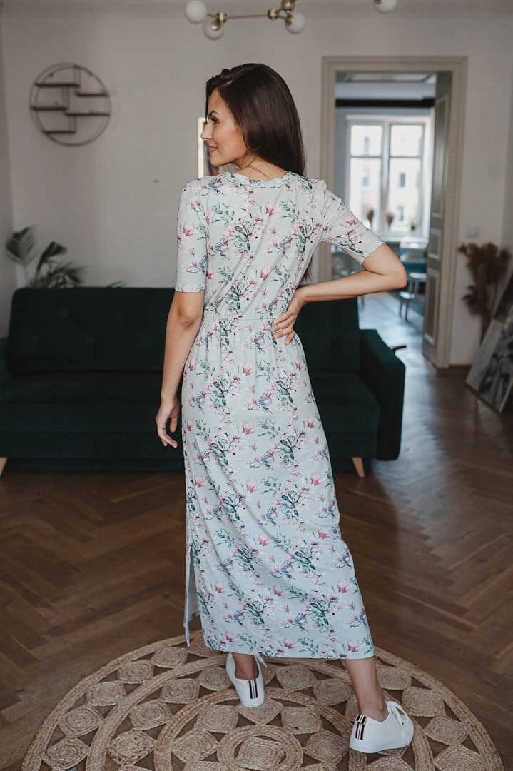 Two Ways LONG těhotenské a kojící šaty s magnóliemi a ptáčky