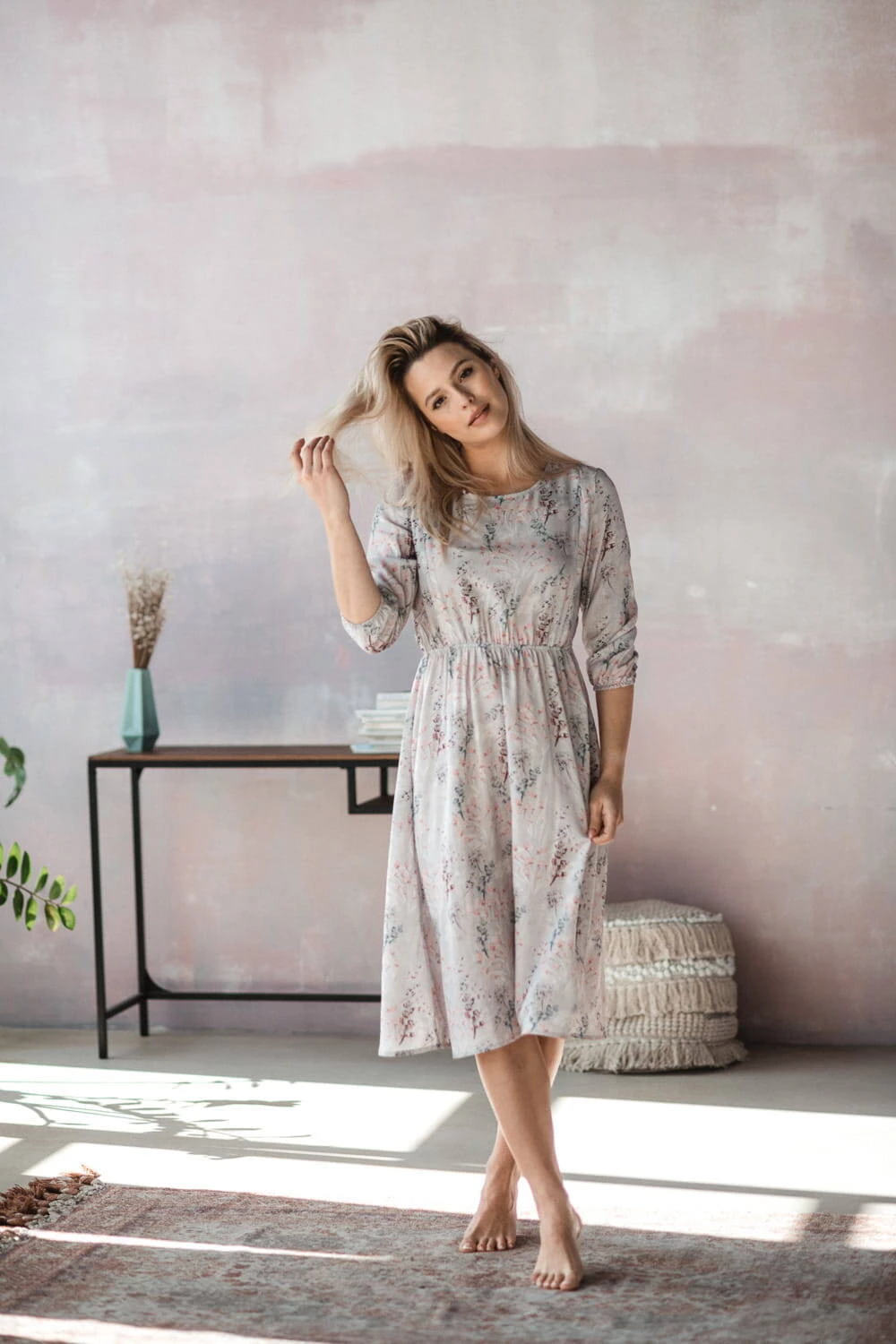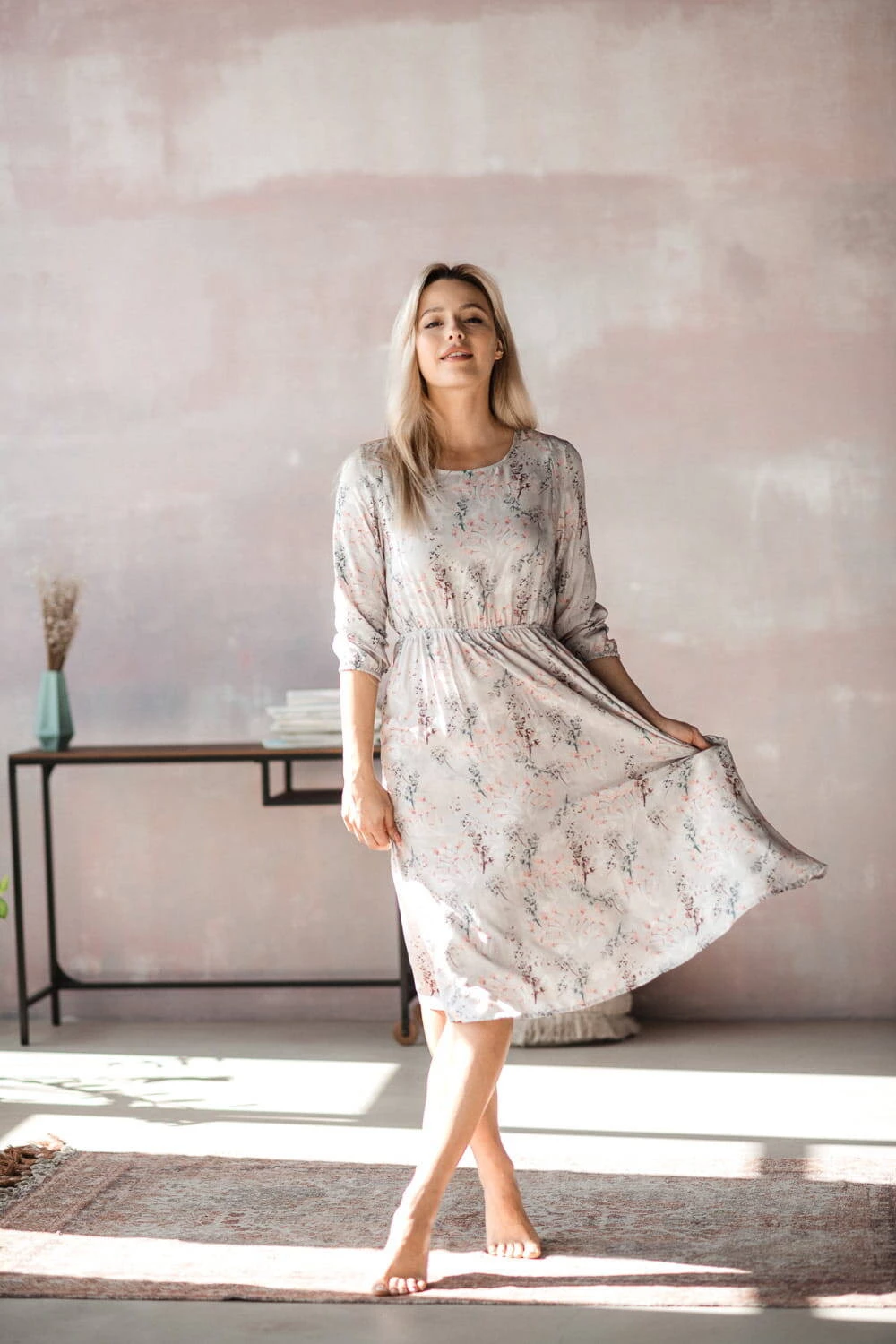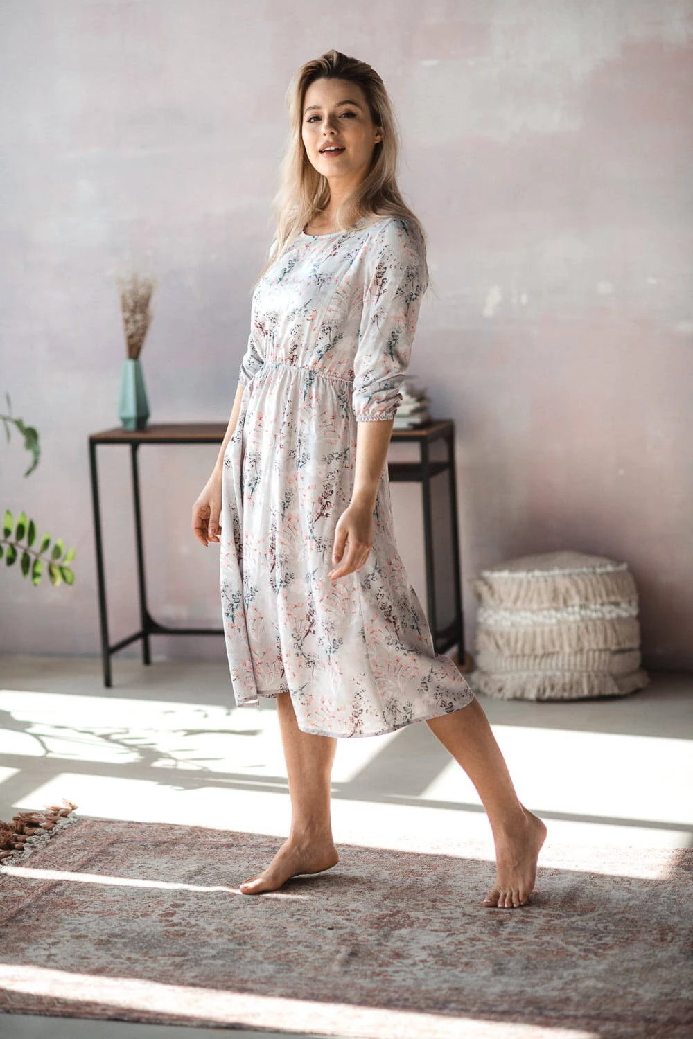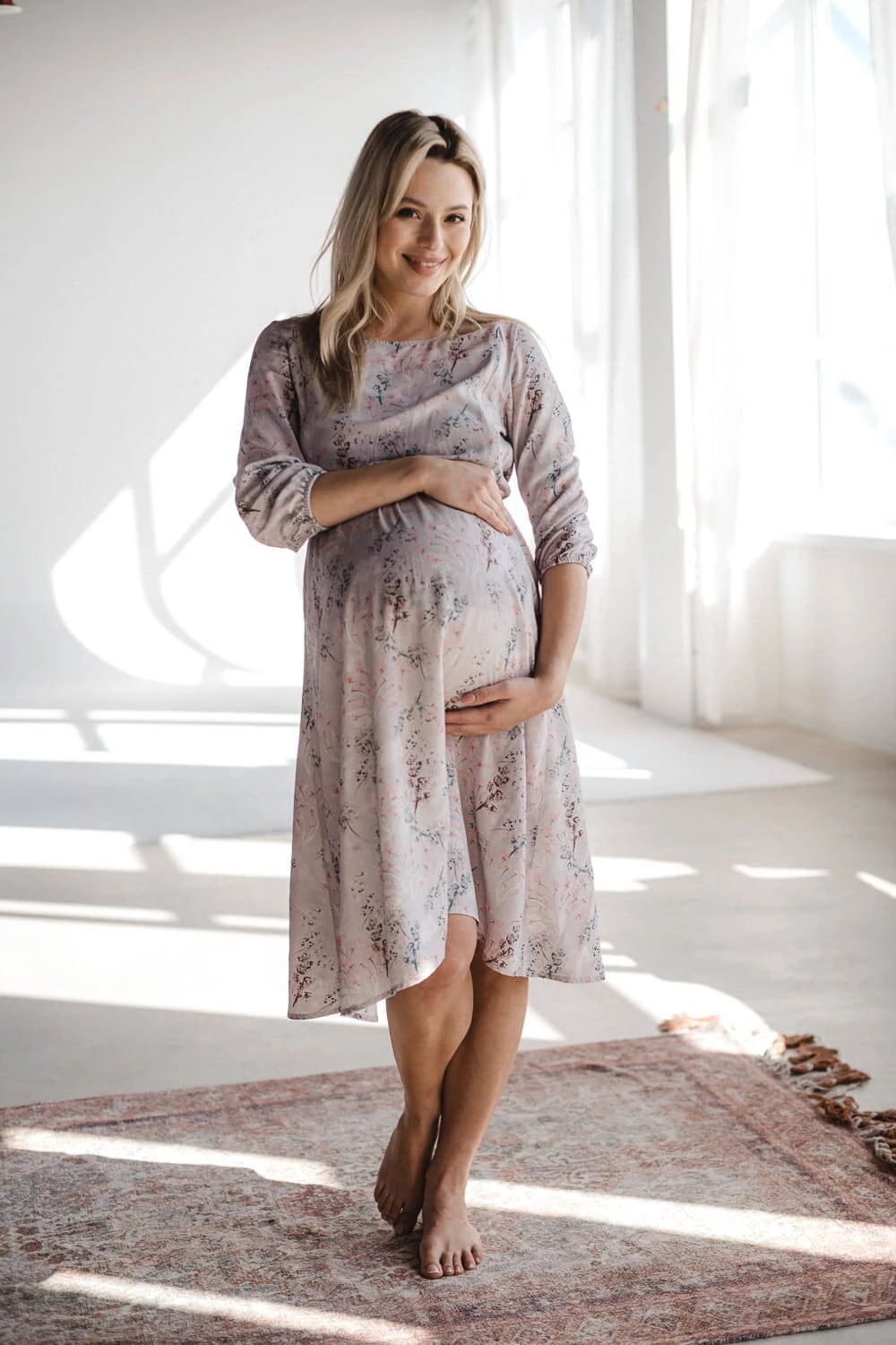 těhotenské šaty podtrhnou vaši ženskost a originální styl! Jedinečné těhotenské šaty od Milk & Love s jemným květinovým vzorem na šedém podkladu, midi délka, jsou ideální variantou pro každou fázi těhotenství i po porodu. Díky praktickému designu a tlumeným barvám ji můžete nosit i po těhotenství. Volný střih šatů pro těhotné s gumičkou pod poprsím zajišťuje pohodlí při nošení a dokonale se přizpůsobí měnící se postavě. Pohodlí budoucí maminky je pro nás velmi důležité, proto jsou tyto těhotenské šaty vyrobeny z kvalitního viskózového materiálu, který zajišťuje příjemný pocit z nošení a volnost pohybu. Jedná se o perfektní těhotenské šaty pro každodenní použití, do práce i na setkání s přáteli. Tyto těhotenské šaty mají navíc skryté zipy, které umožňují snadné kojení, a jakmile tato fáze skončí, budou šaty stále stylovým doplňkem vašeho šatníku.