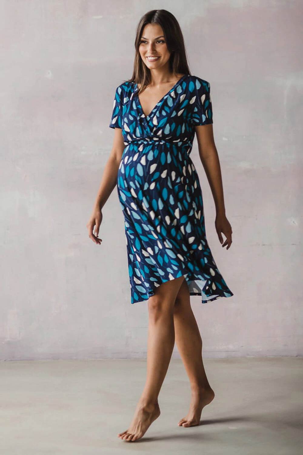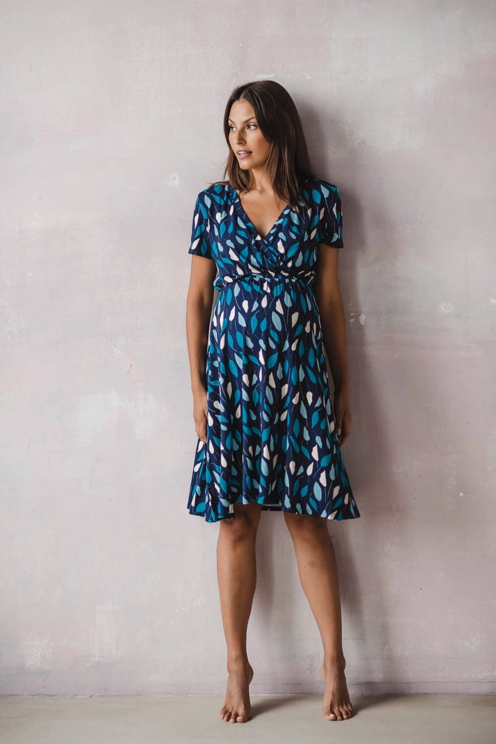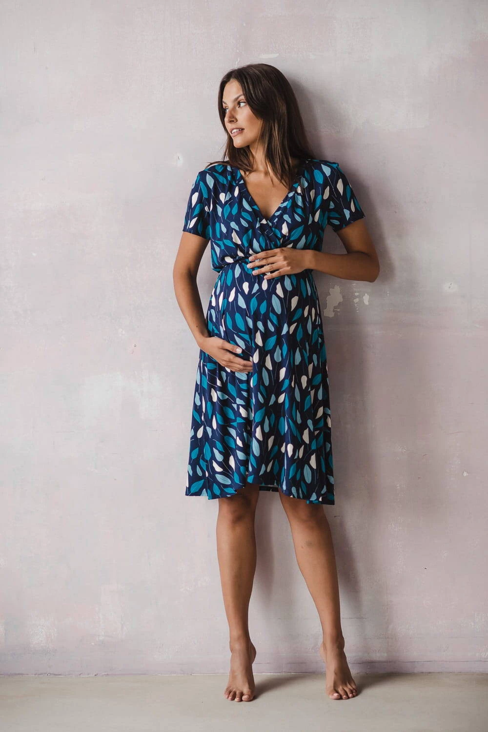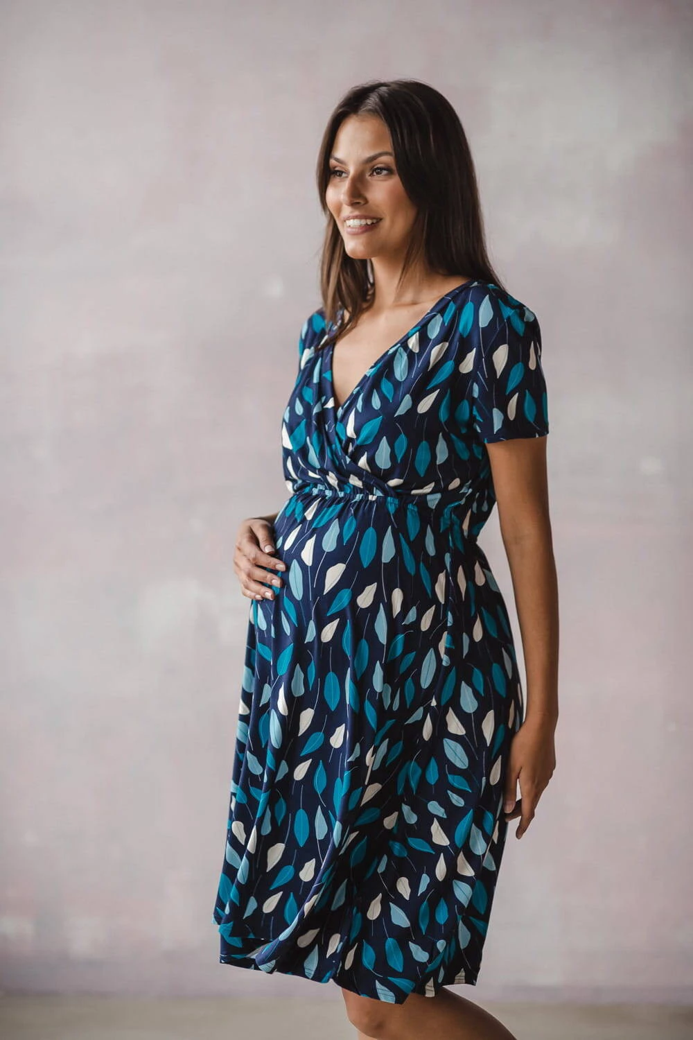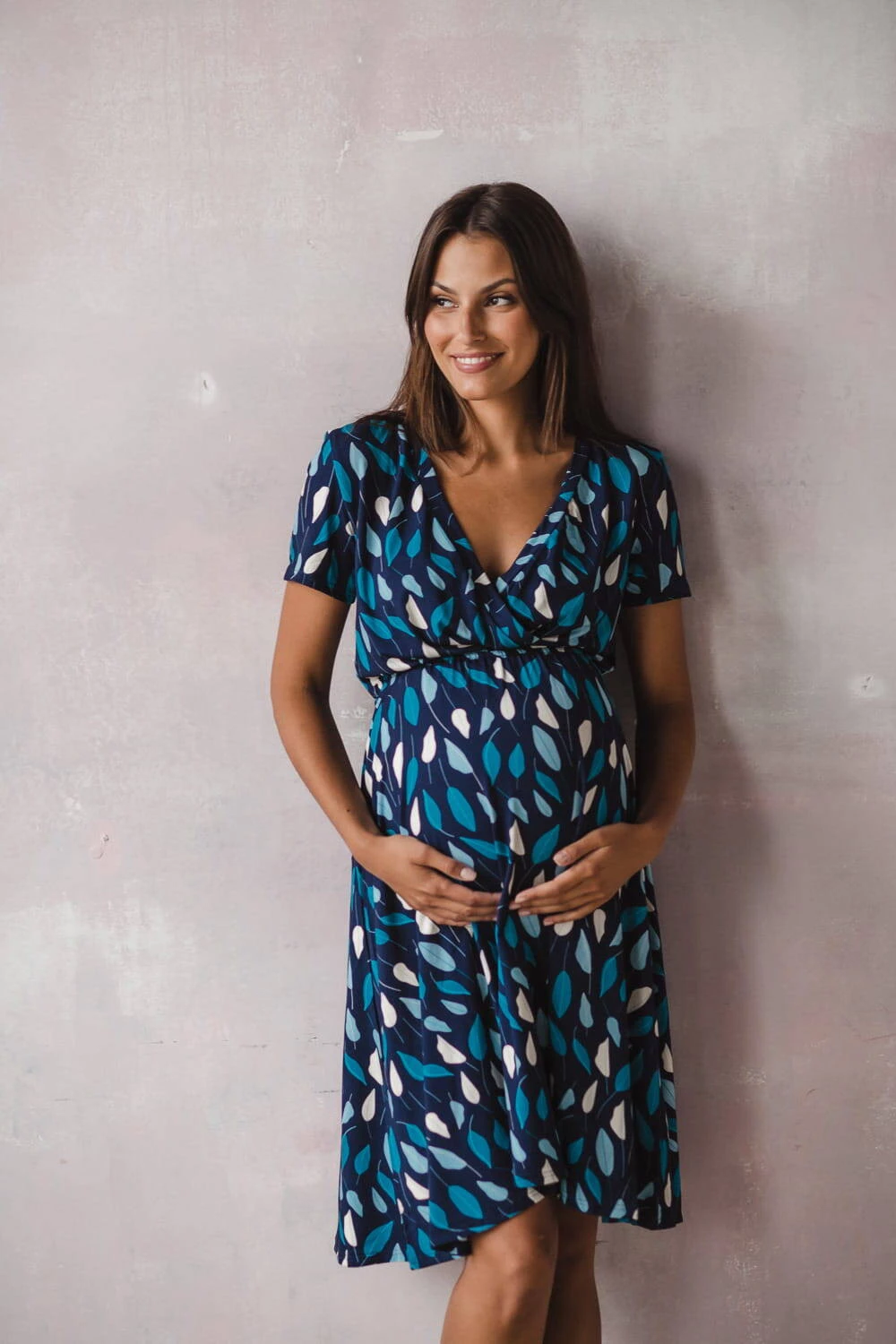 Two Ways MIDI těhotenské a kojící šaty s krátkým rukávem, tmavě modré listy
