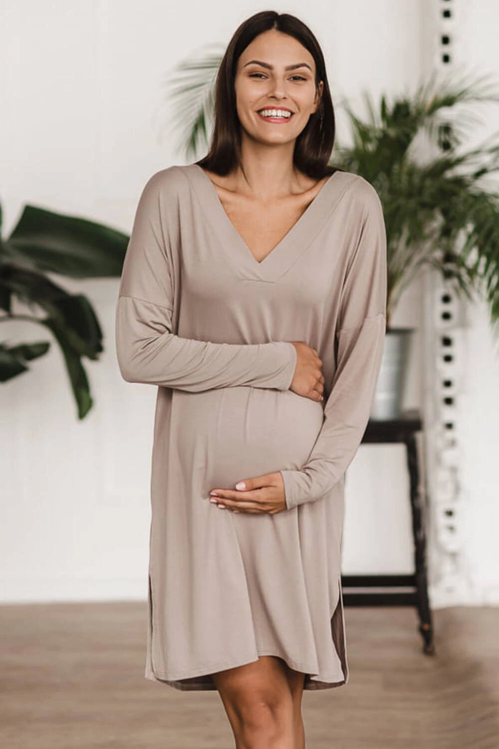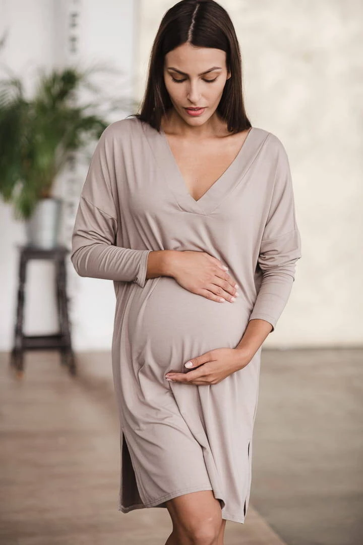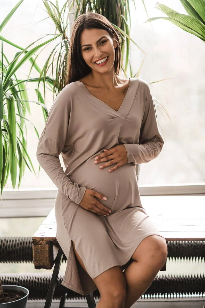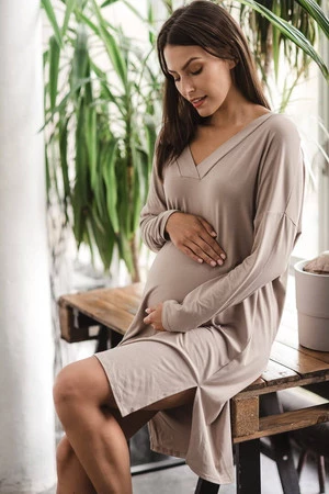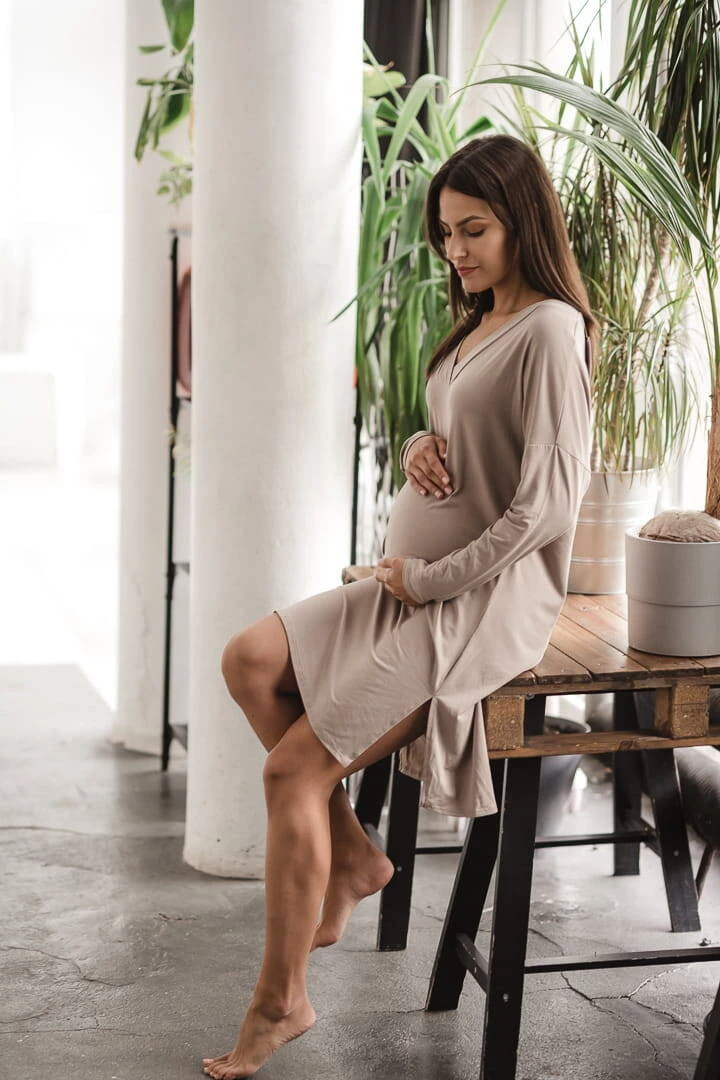 Bambusová těhotenská a kojící noční košile s dlouhým rukávem, Moon béžová
