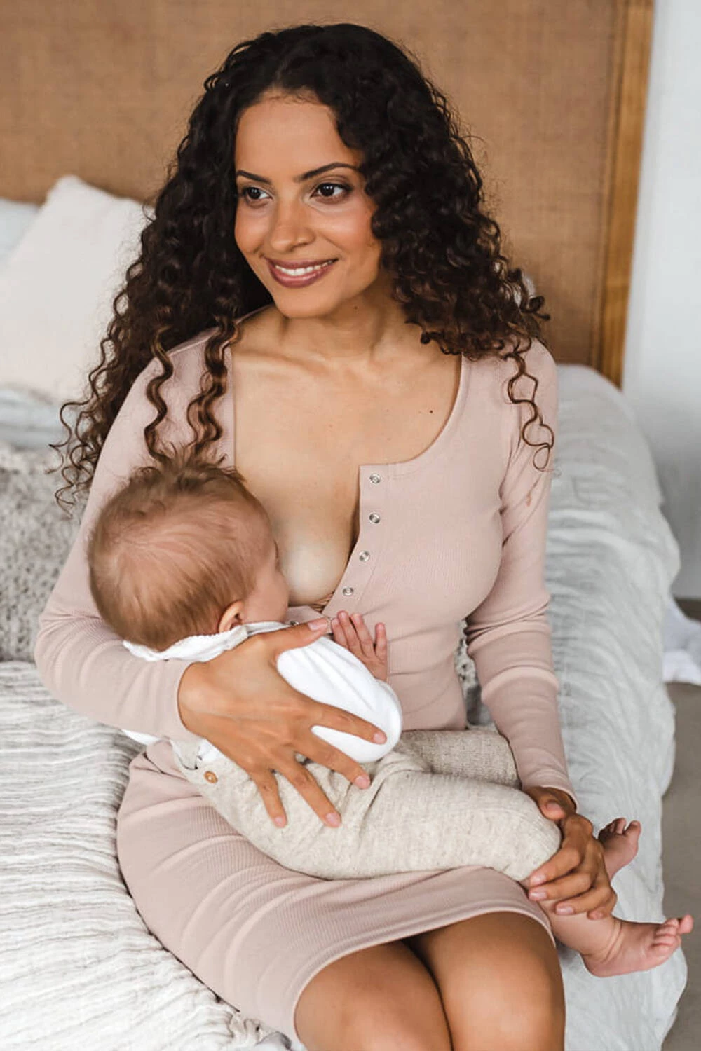 Atraktivní šaty pro kojení a těhotenství z žebrované látky v jemném béžovém odstínu poskytují bezkonkurenční pohodlí a podtrhují ženský styl. Díky použití vysoce kvalitních materiálů, které si zachovávají svou strukturu a zajišťují pohodlí při nošení, vás naše šaty pro kojící maminky a těhotné ženy budou provázet po mnoho měsíců. Tyto klasické těhotenské šaty mají vypasovaný střih a zlaté cvočky u výstřihu, takže kojení je snadné a diskrétní. Pohodlné šaty pro těhotné, perfektní pro kojení, lze nosit i po porodu. Naše bříška jsou spolehlivá od prvních měsíců těhotenství a po tomto období je může novopečená maminka upravovat na různé příležitosti jako běžné šaty.