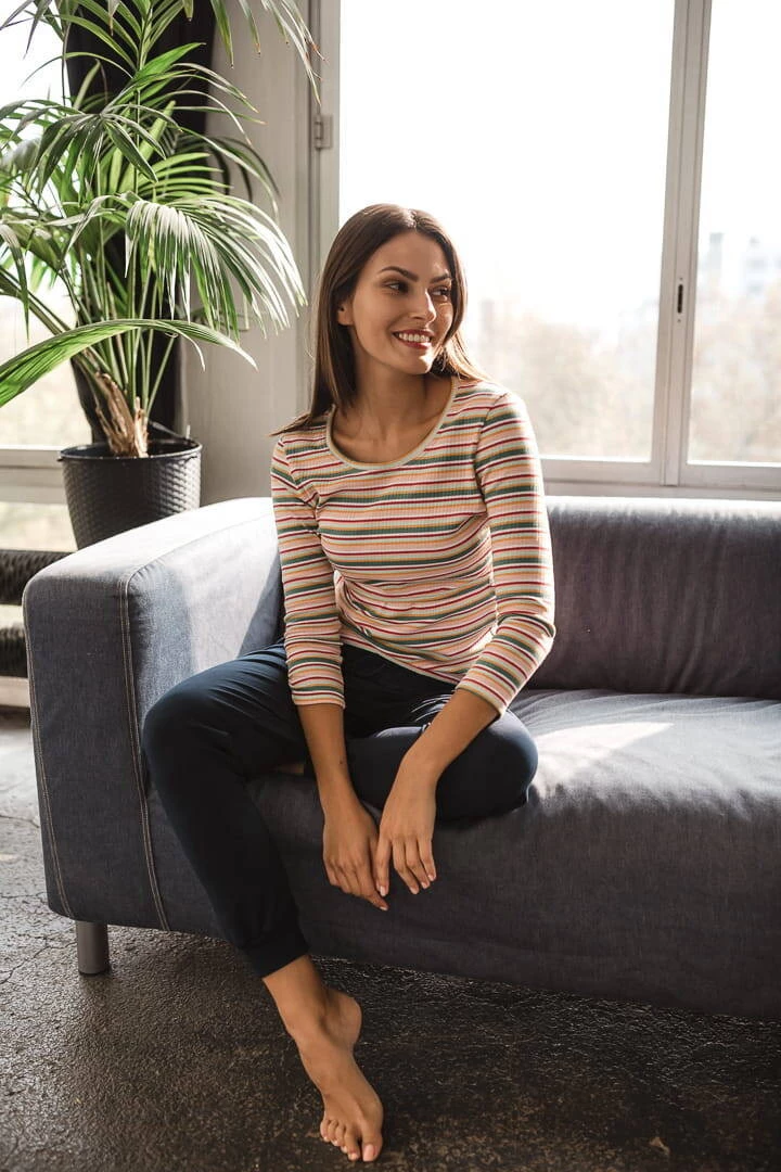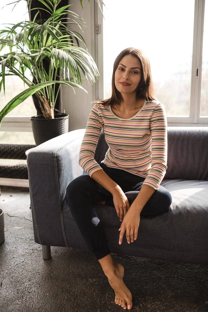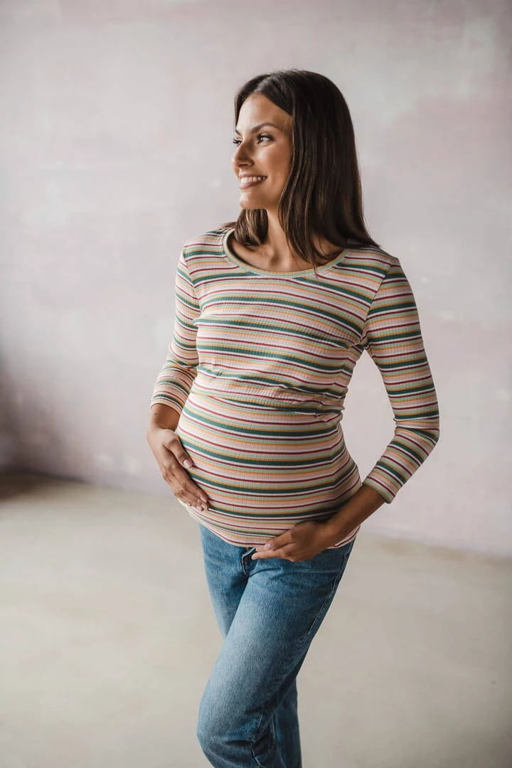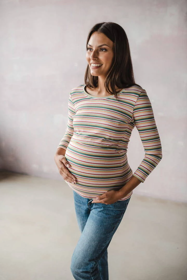 Módní a pohodlná těhotenská halenka se 7/8 rukávy a pruhy je perfektní outfit pro každou příležitost od prvního trimestru těhotenství. Na obou stranách bříška mají dámské těhotenské halenky všitý panel, který se přizpůsobí těhotenskému bříšku a změnám na postavě. Vršek těhotenské halenky pro těhotné má všitý speciální panel , který se přehne nahoru, díky kterému můžete novorozence snadno a rychle nakrmit. Perfektní těhotenské a kojící halenky vám poskytnou pohodlí a komfort v těhotenství i později při kojení. Pohodlí budoucí maminky je velmi důležité, proto se vyplatí investovat do oblečení, které jej zajistí. Vyberte si barevné halenky pro těhotné a uvidíte, jak pohodlné mohou být těhotenské halenky, když se tělo po těhotenství vrátí do své formy.